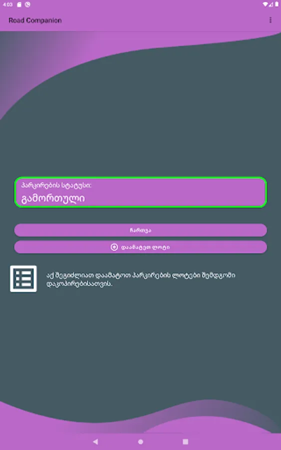 Road Companion notifies its subscribers via an audible signal about the termination of zonal parking period and reminds to turn off the parking timer in order to avoid extra payment. Notification about the parking period termination is automatically sent to the customer as soon as the vehicle leaves the parking zone.