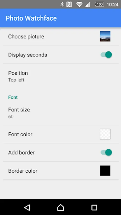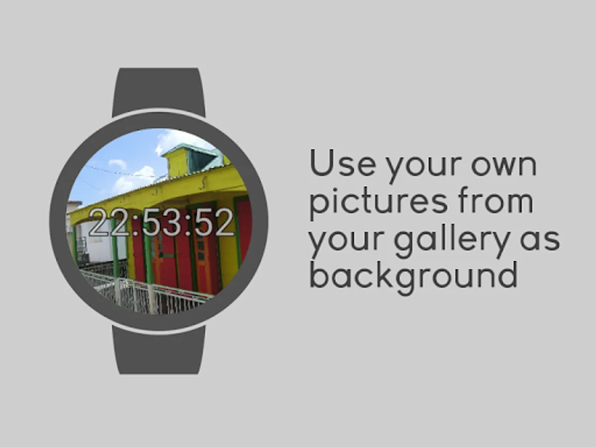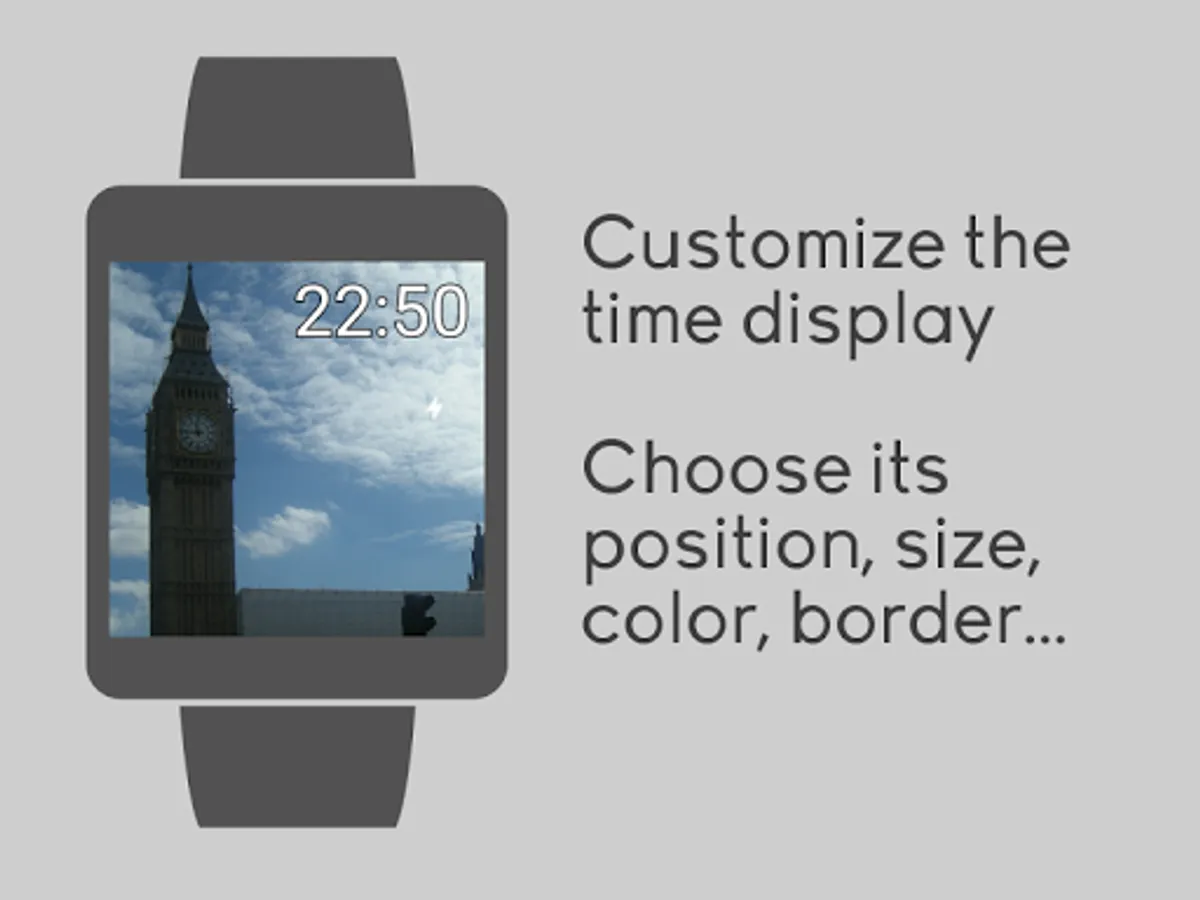 Choose any picture from your gallery, setup the time display with simple parameters, and your watchface is ready !