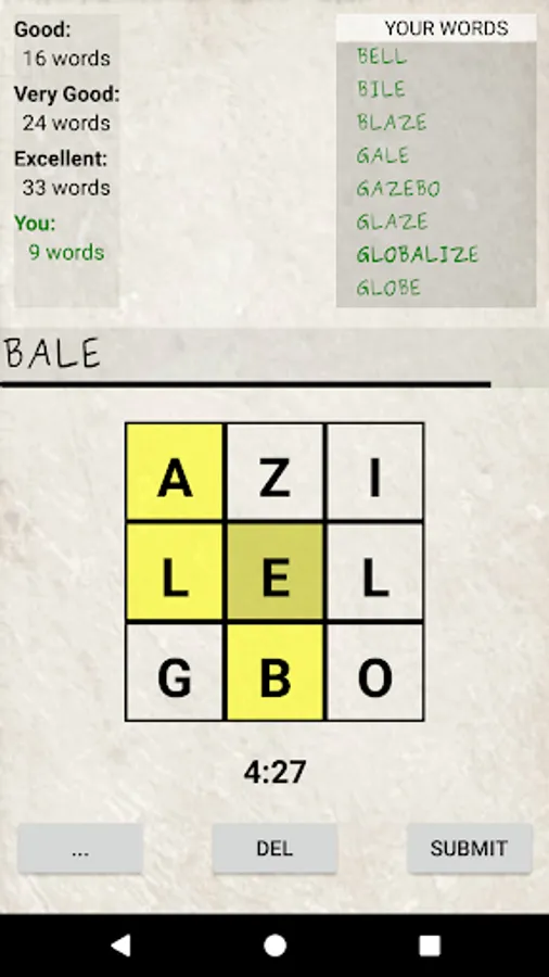 From a 9-letter grid, find words of 4 letter or more. Words must contain the middle letter, and there is at least one nine-letter word.