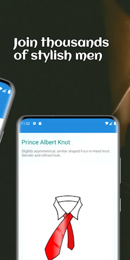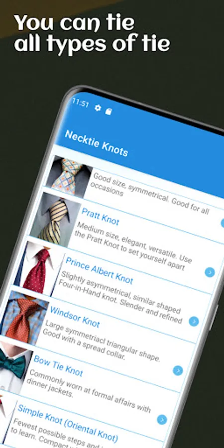 13 ways how to tie a tie knot. А perfect tie knot seems impossible for many men. Lots of them spend much time near the mirror trying to tie a tie. And the only idea of knot tying makes them feel nervous. If you feel something like that we know how to help you. This application will guide you step by step how to tie a tie knot for any occasion.