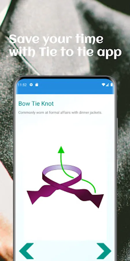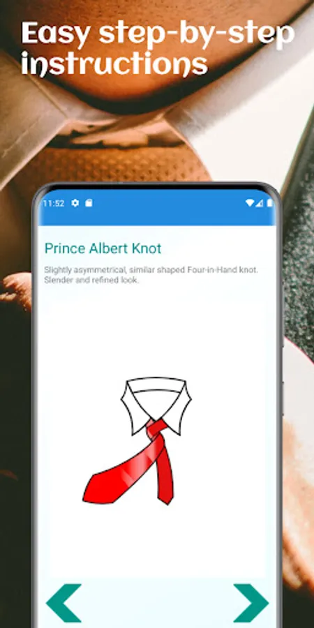 Our application is a step by step instruction. All the tie knots are shown on the simple pictures. It’s easy to follow the instruction: you just look at the picture and repeat the action on your tie. If something goes wrong, you always can go back to the previous picture and do it again.