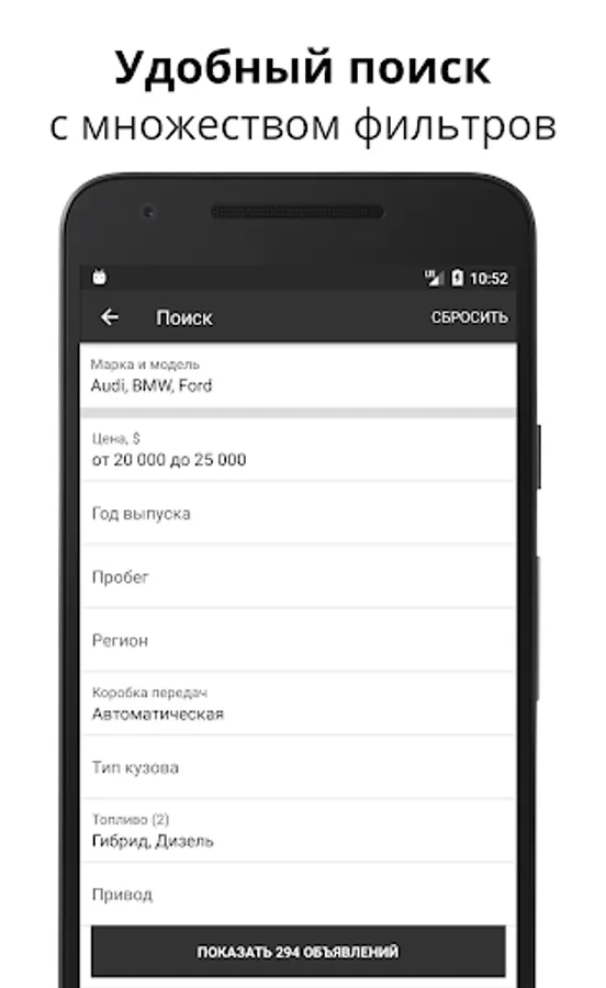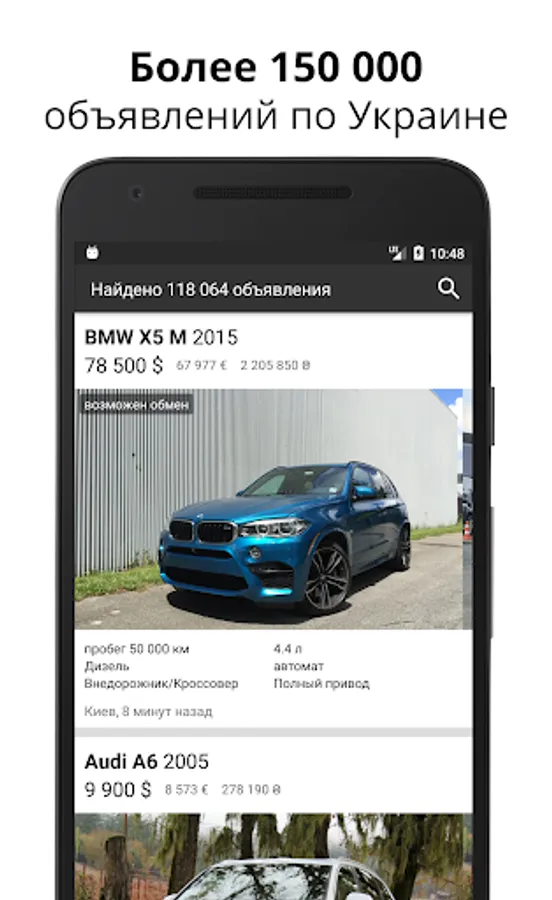Install the official application carsua.net and get access to all the ads for the sale of cars in Ukraine. We have collected for you all the ads on the sale of used cars from the most popular Internet resources (auto.ria.com, ab.ua and others). With convenient search and filters, you quickly and easily find the car you need among hundreds of thousands of ads.