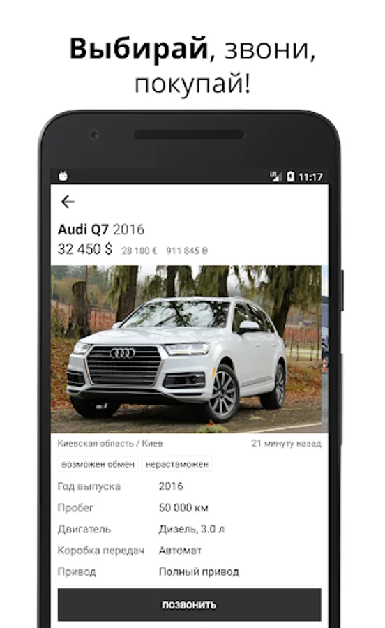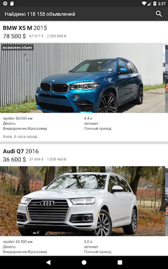 With our application you can easily buy a car anywhere in Ukraine: Kiev, Odessa, Lviv, Dnipro, Ivano-Frankivsk, Kharkov, Vinnitsa, Rivne, Zakarpattya, Nikolaev, Zhitomir, Sumy, Cherkassy, Donetsk, Ternopil, Khmelnitsky, Chernigov, Kirovograd, Lugansk, Zaporozhye, Lutsk, Uzhgorod, Kherson and other cities and regions.
