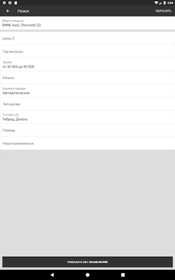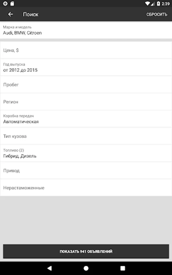 • Indicate the parameters you are interested in: year of manufacture, price, mileage, type of gearbox and drive.