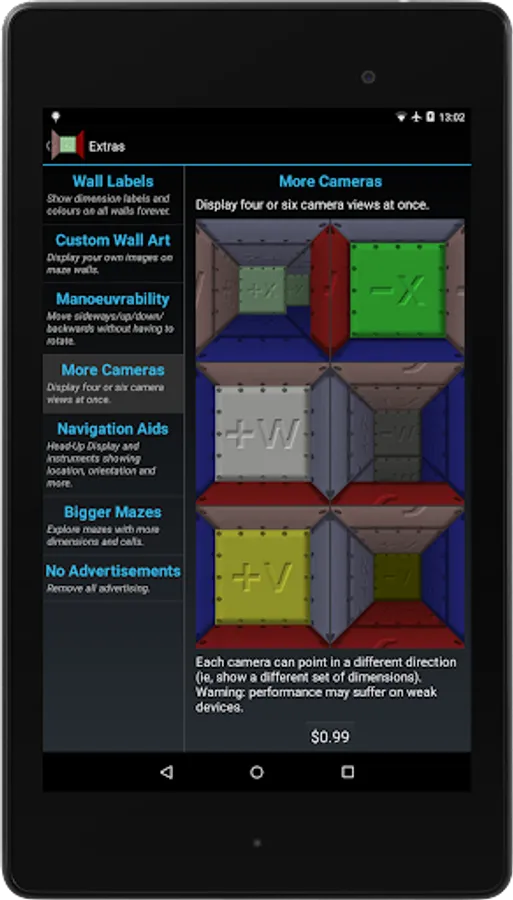 Since Hypermaze has to draw multiple independent images simultaneously, weaker devices won't get great frame rates and/or may not be able to handle very large mazes. Verify that your device can handle Hypermaze before buying any in-app purchases.
