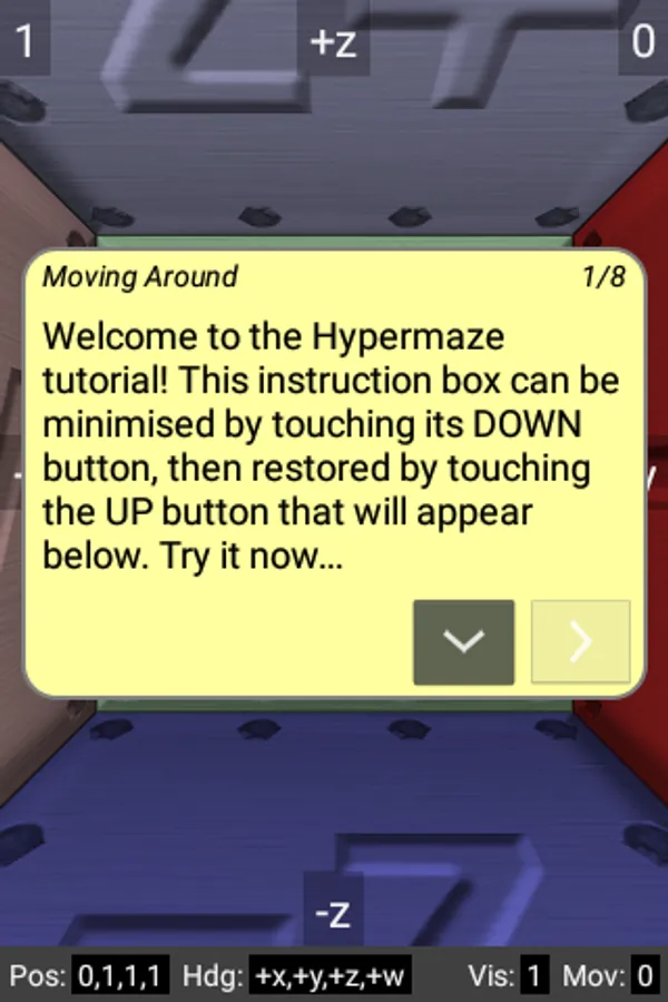 You control a four-dimensional ship that's trapped in a four-dimensional maze. You view the maze through one or more cameras, each of which can provide a 2D or 3D image. You can point each camera in a different direction—including in different dimensions (eg, you can have one camera viewing x,y,z and another viewing x,w,v).