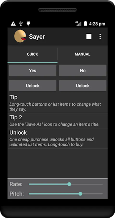 ● You can assign text to buttons and list items for quick access. For free, you get two buttons (four on tablets) and four list items. After an amazingly cheap in-app purchase, you get twice as many buttons and unlimited list items.