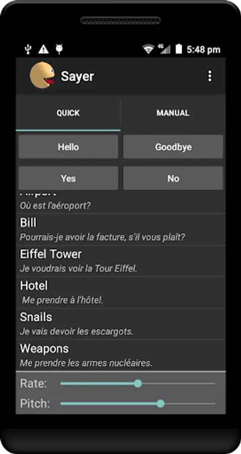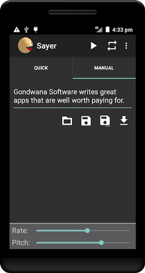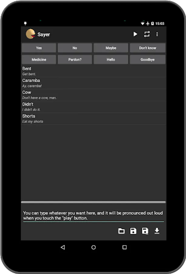 ● Your device's text-to-speech engine must be installed and configured. Sayer uses the default engine and voice. If you don't like Android's default, try SVOX or Ivona.