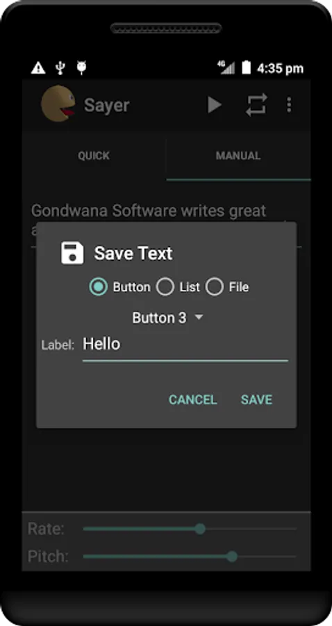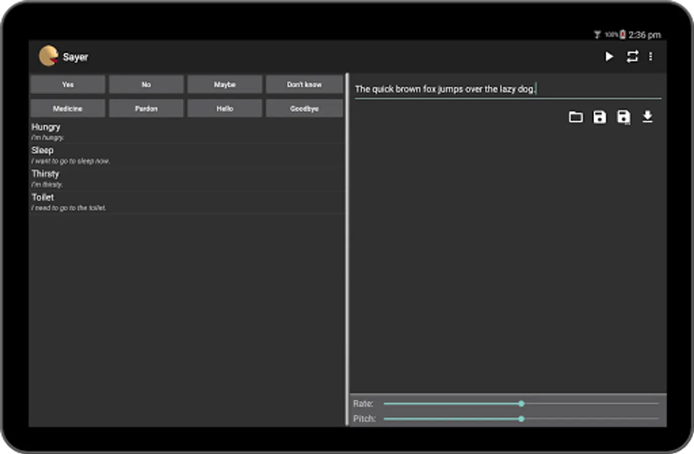 ● Sayer can open text files created in other apps if you copy them into Sayer’s external files directory. The location of this will depend on your device, but it will probably end in “Android/data/net.catplace.sayer/files/”.