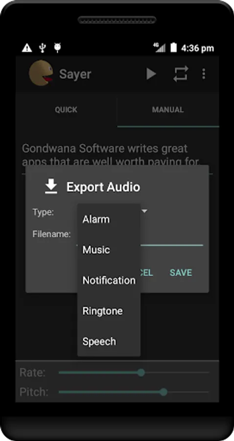 ● The pronounciation can be exported as a sound file, which can then be used as an alarm, music, notification and/or ringtone. Apps that don’t use Android's default sounds will need to be manually configured to use the exported sounds.