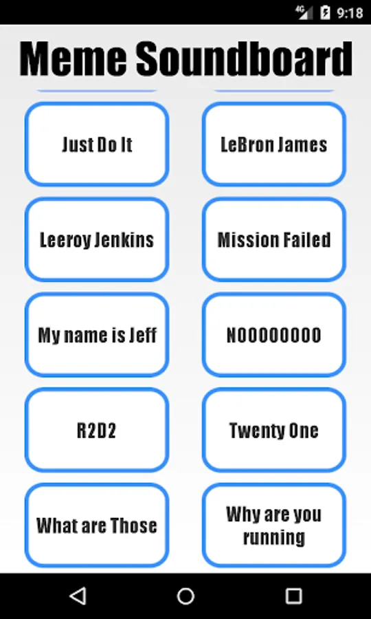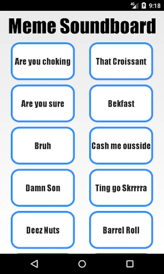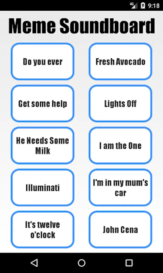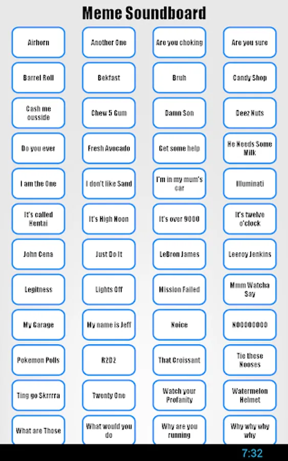 Profanity-free soundboard with 49 of your favourite dank memes, including "Deez Nuts", "John Cena", "He needs some milk", "My name is Jeff", "I don't like sand", "LeBron James", "What are those!?" and many more!