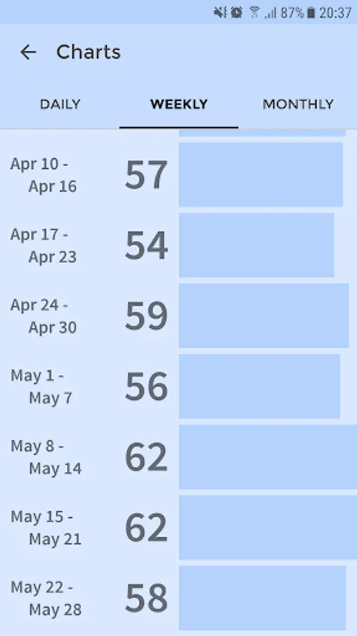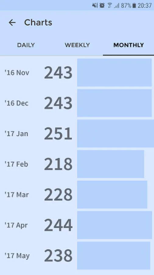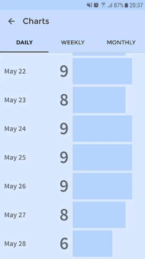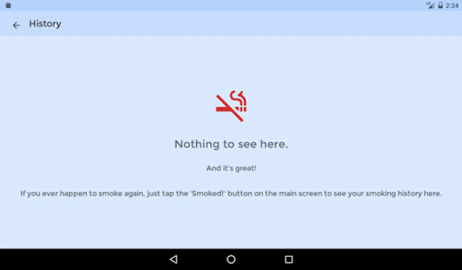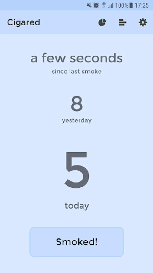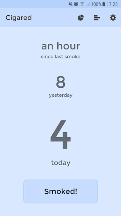 Just tap on the button each time you smoke and you will be provided by clean and easy to understand bar-charts on daily, weekly and monthly basis.