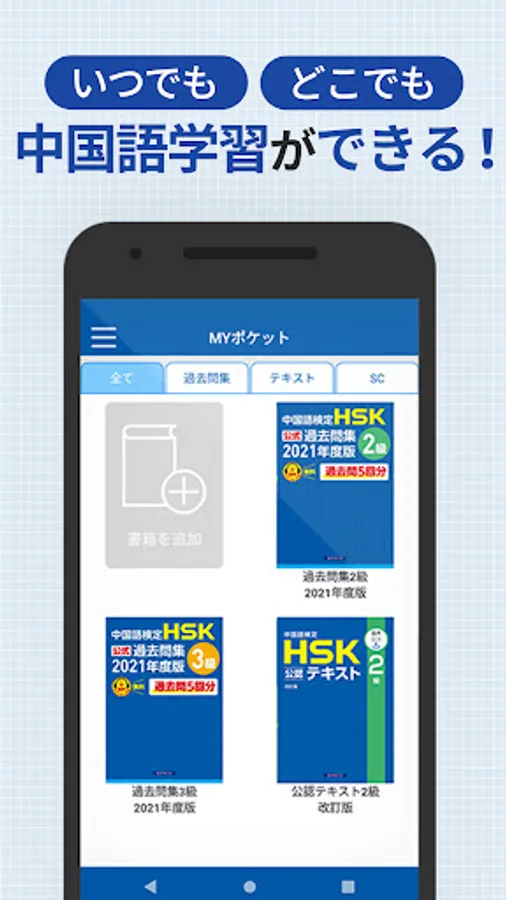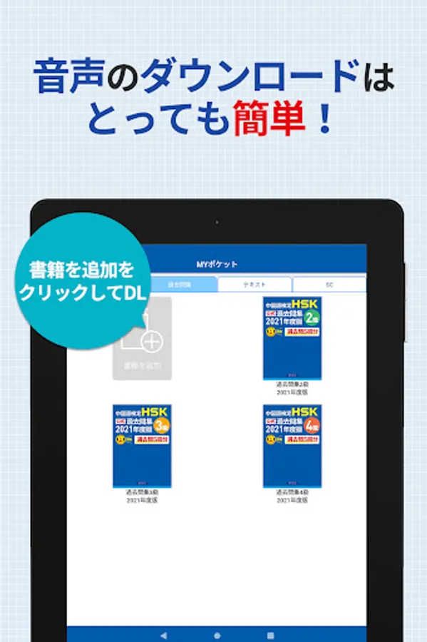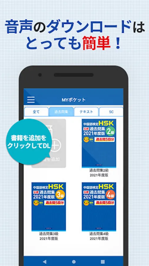 "HSK Voice Pocket" makes it easy to use your smartphone to read the voice that comes with the "Chinese Test HSK Official / Official Series" published by SPRIX! For free! It is an application that can be downloaded.