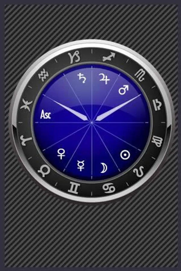 shows a clock and a horoscope chart with the sun, the moon, Mercury, Venus, Mars, Jupiter, Saturn, and the ascendant.