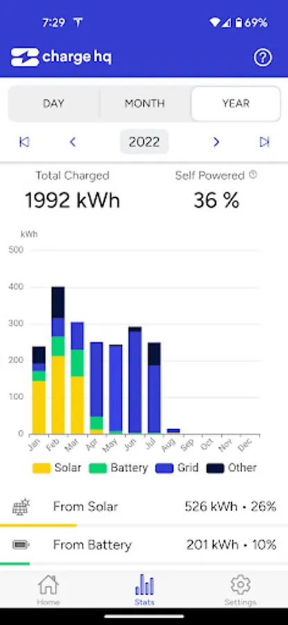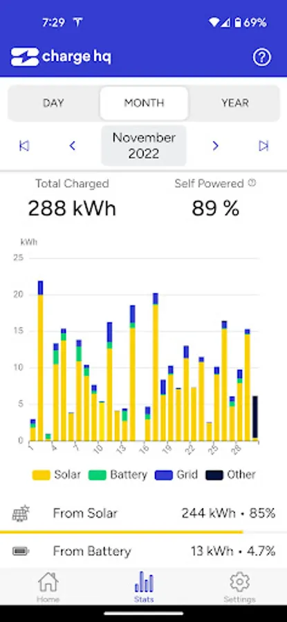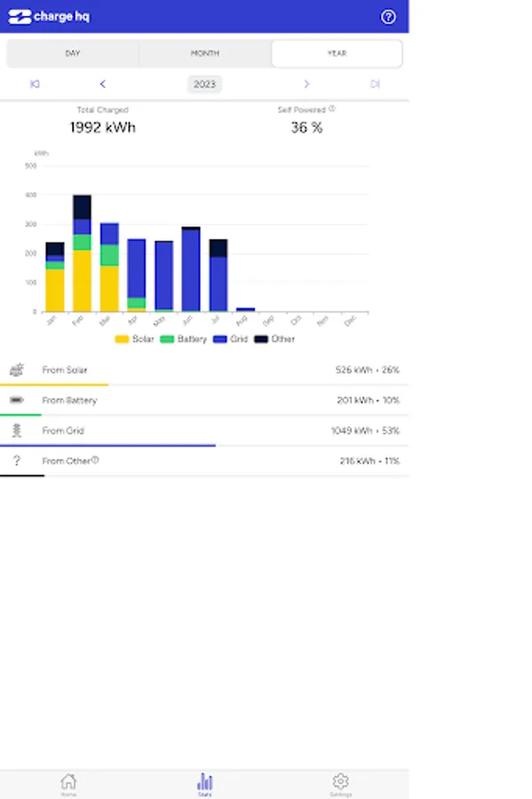 - detailed charging history, including a breakdown of how much energy came from solar vs the grid