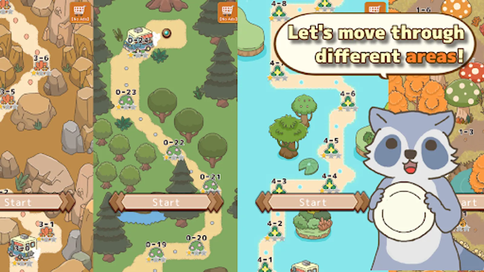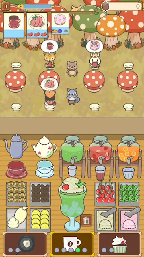 The bear cub and raccoon help manage the restaurant! The forest is filled with many animals such as cats, dogs, rabbits, foxes, and alpacas who visit as customers. Respond to their requests and serve them delicious food.