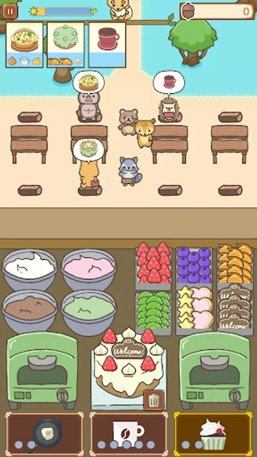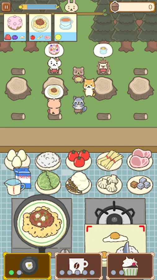 If you're not a fan of cooking games where customers get angry and leave quickly... this game is perfect for you. Customers who arrive within the time limit will wait patiently for their orders, so you can take your time cooking. If you serve food quickly, you can progress faster, but if you take your time and complete stages multiple times, you'll collect acorns to level up and make the game easier. Don't rush—take it slow!