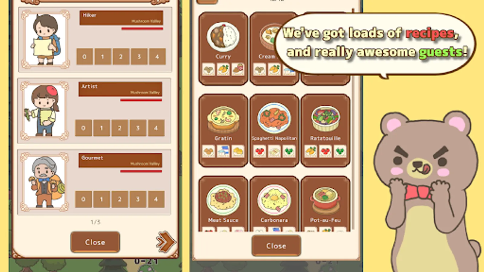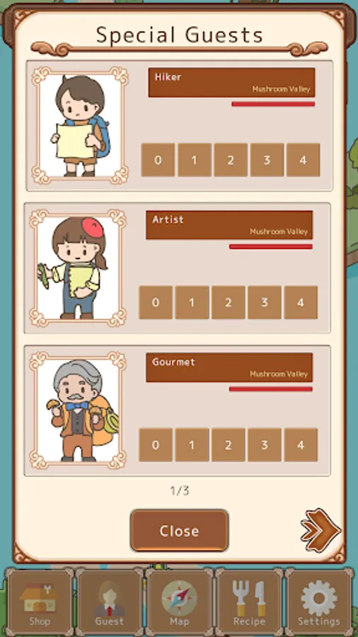 As you explore the forest, special customers may visit. Think about their favorite dishes, combine ingredients, and serve them to make them regular customers! Additionally, you can read their stories in a comic format when they are satisfied.