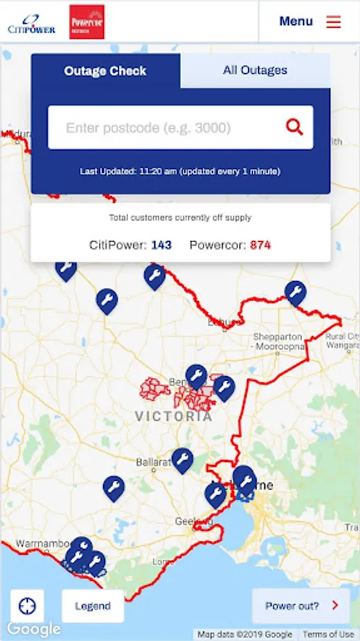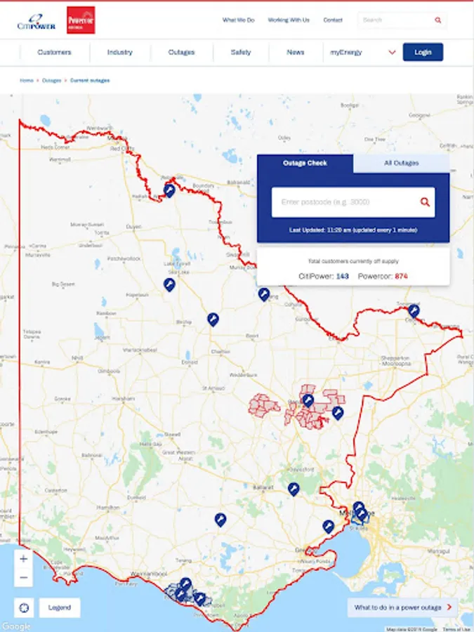 View affected areas and estimated restoration times for current power outages in the CitiPower and Powercor Australia electricity networks.