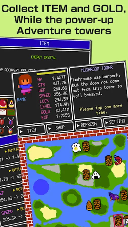 While climbing the tower that exists in the world map, while looking for a treasure box, while the level up and money collected to defeat the enemy, while defeat the boss, while looking for the other tower, we will proceed.