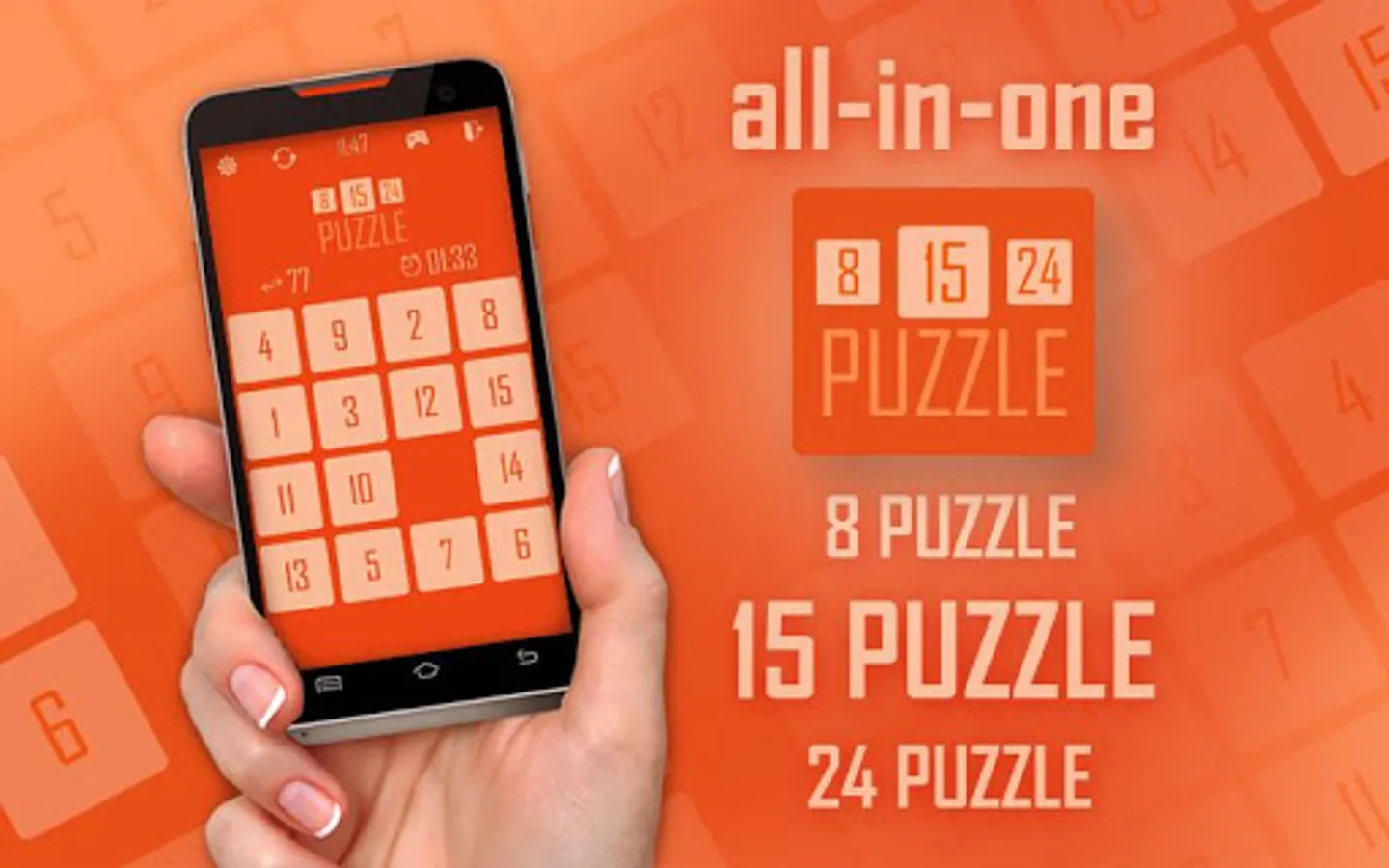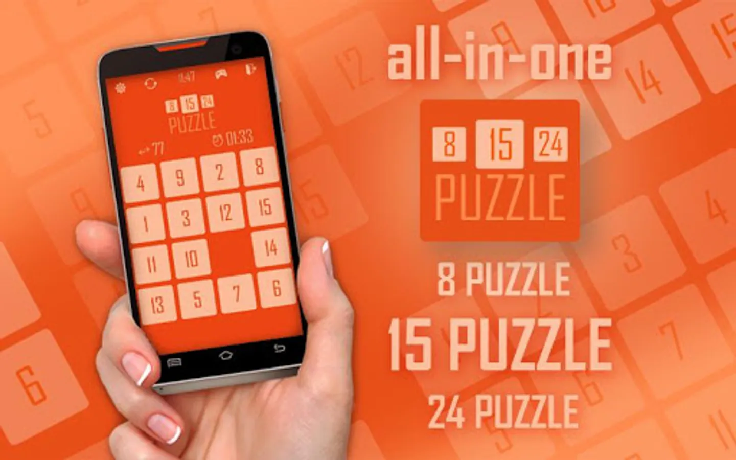 15 puzzle HD (Gem Puzzle) is a classical puzzle game invented in 1878, it’s still popular today. The 15-puzzle is a sliding puzzle that consists of a frame of numbered square tiles in random order with one tile missing.