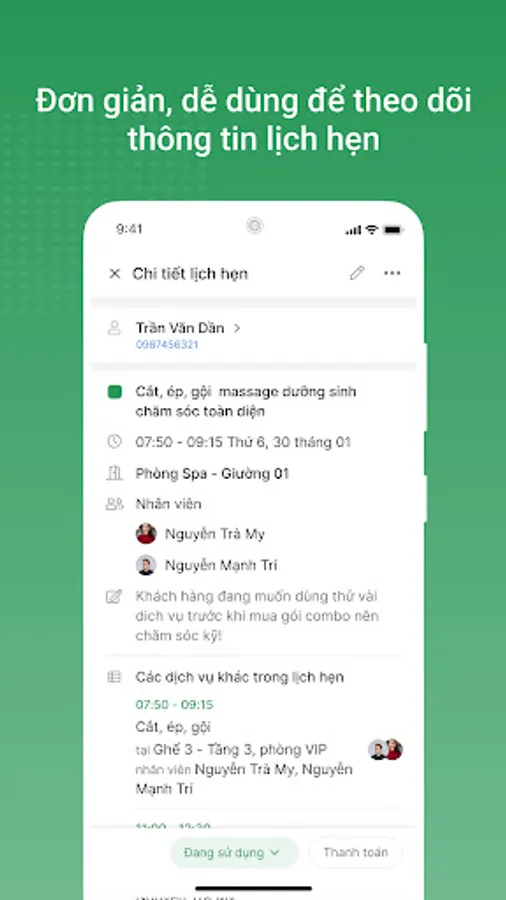 Quickly book appointments for customers with full details (Full name, phone number, date...), arrange staff, specific room beds to avoid overlapping management.