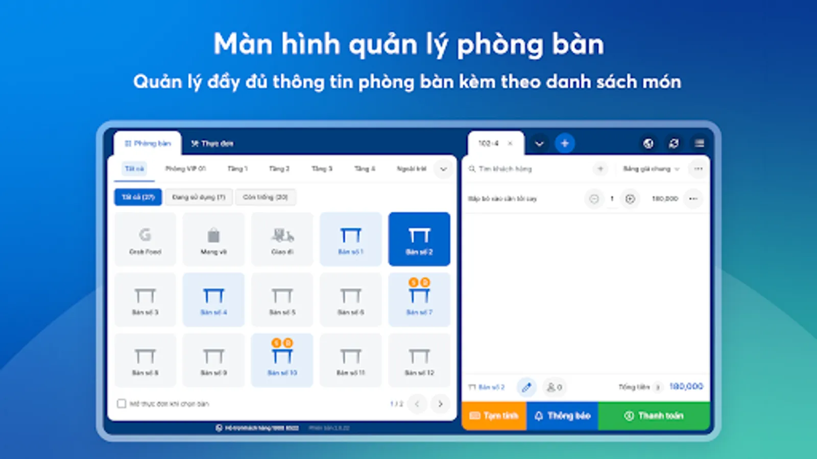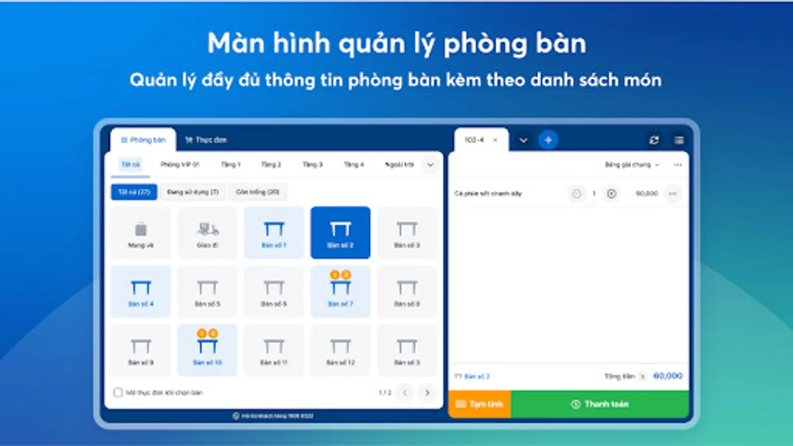 Manage desk rooms with full information such as: status of rooms available or in use, list of dishes by table, bill details by table...