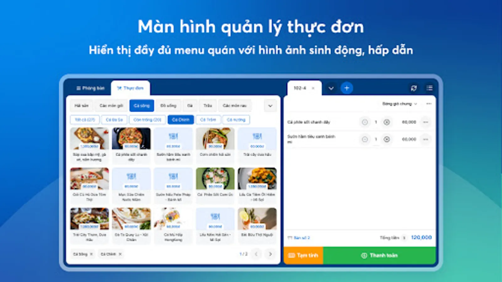 The entire menu of the restaurant is displayed in full and details on the screen of the POS TOUCH machine such as dish names, prices, and illustrations to help customers choose easily.