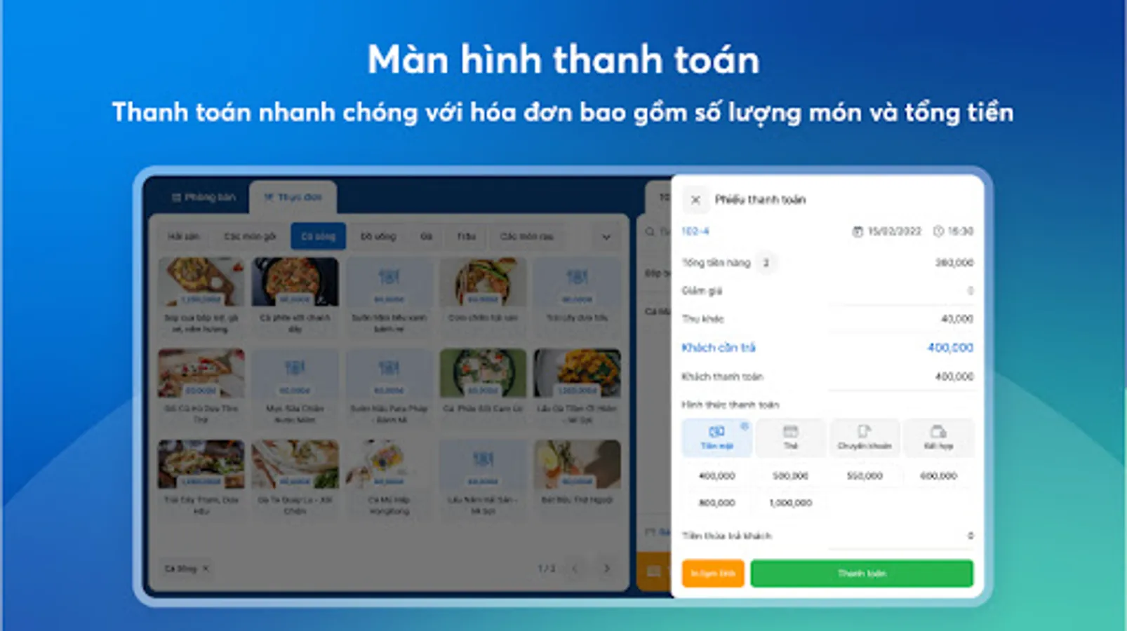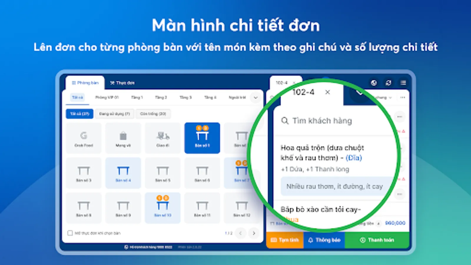 Order food quickly and conveniently with touch and select on the screen. The staff can easily add/remove dishes, add toppings or make notes on customers' individual requests about the dishes being ordered