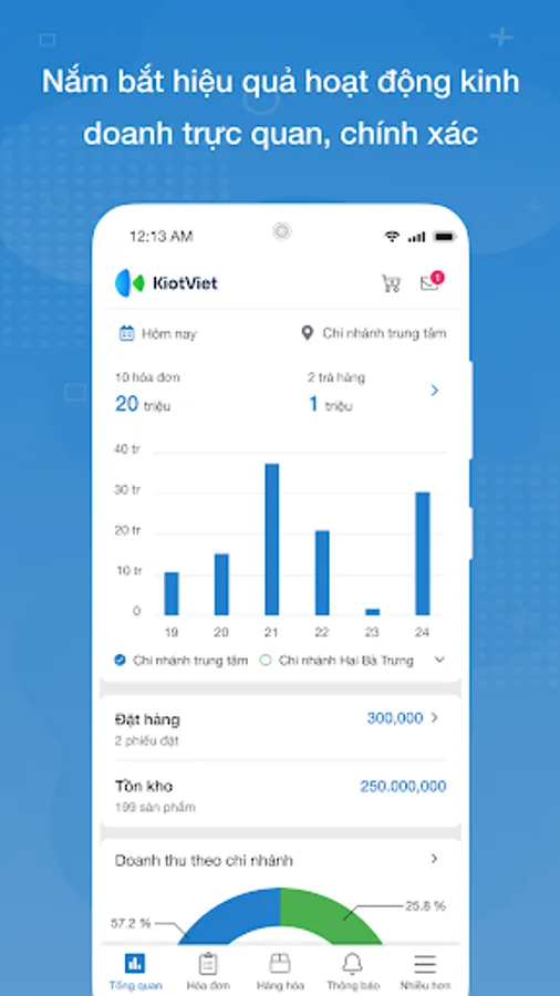Ứng dụng giúp bạn dễ dàng theo dõi, giám sát hoạt động bán hàng của các chi nhánh, đồng thời giúp bạn so sánh đánh giá hiệu quả kinh doanh của mỗi chi nhánh trong hệ thống.