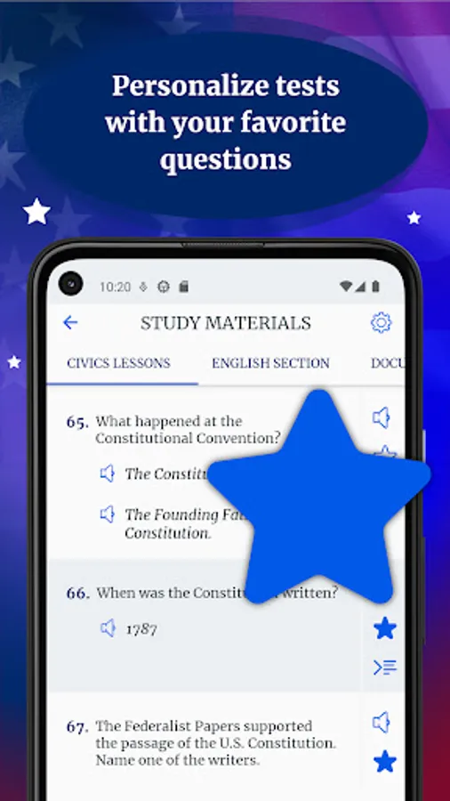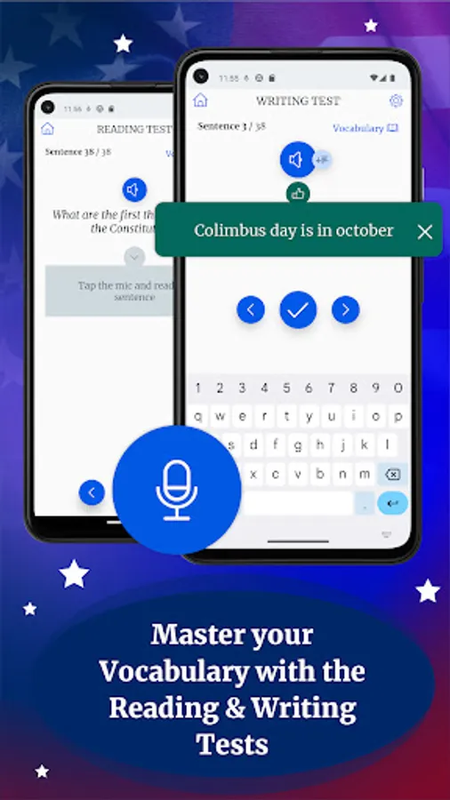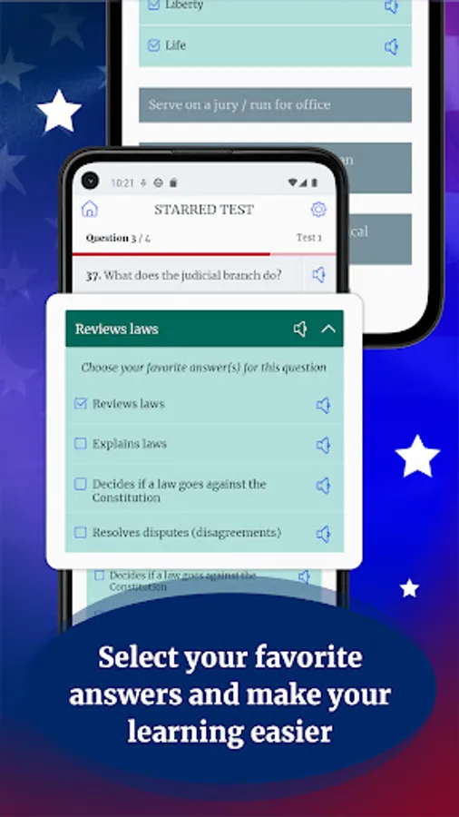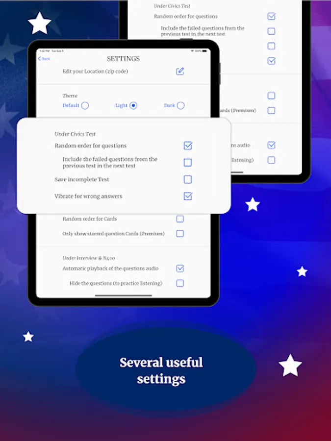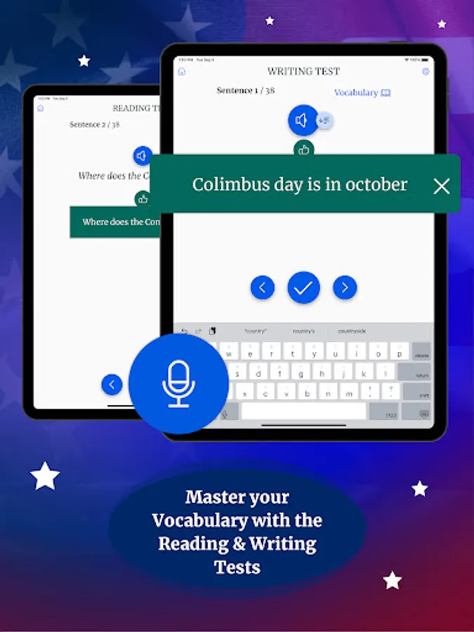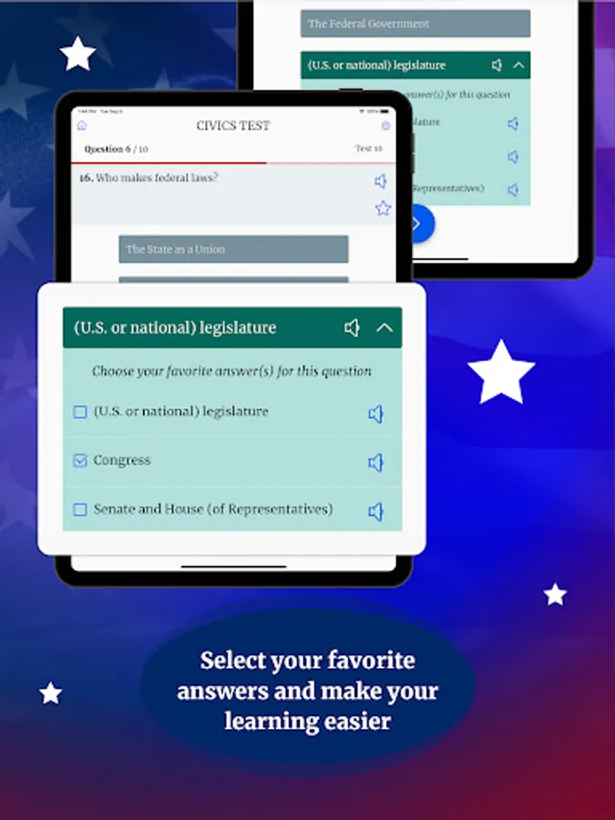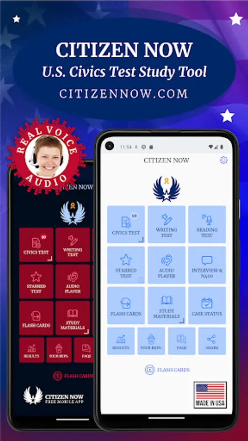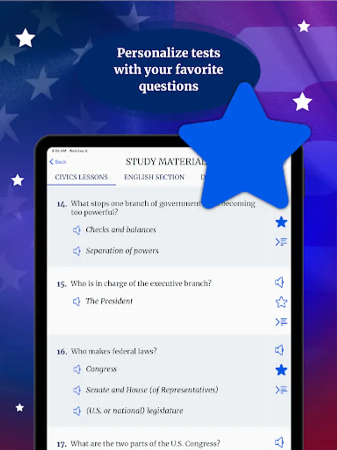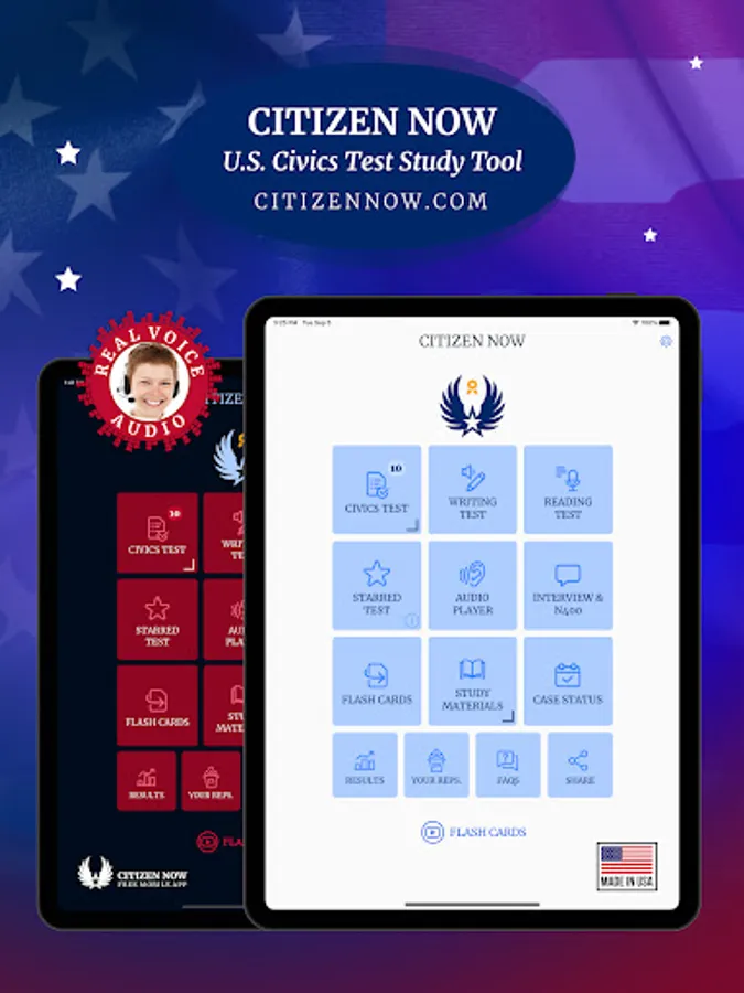 • Interactive Civics, Reading, and Writing Tests with genuine voice audio, providing a comprehensive learning experience.