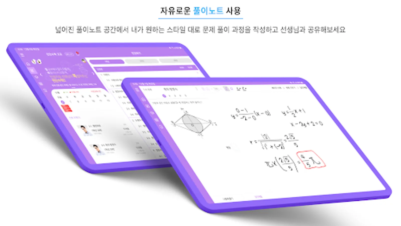 진단수학 태블릿은 넓은 공간을 활용하여 자유롭게 풀이 과정을 작성한 풀이노트를 선생님과 공유하여 학습할 수 있습니다. 진단수학 태블릿은 정기구독 멤버십을 필요로 합니다.