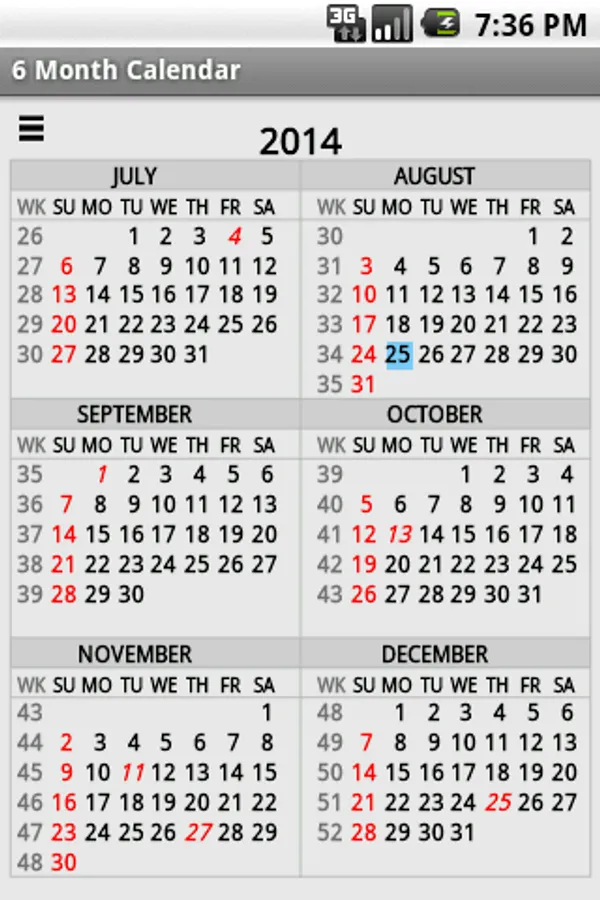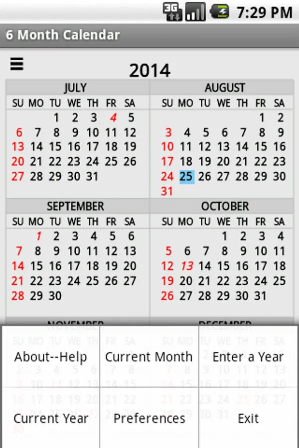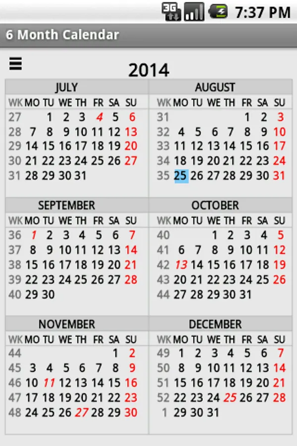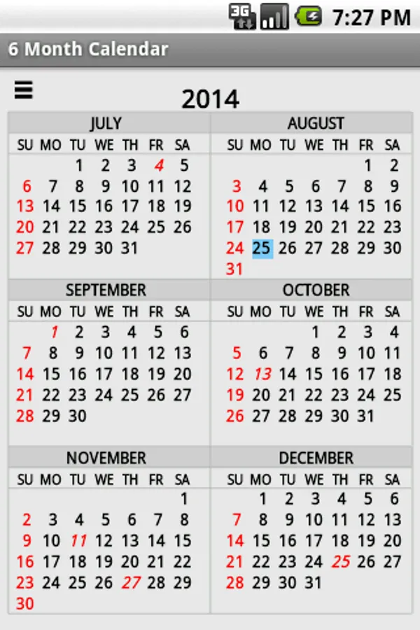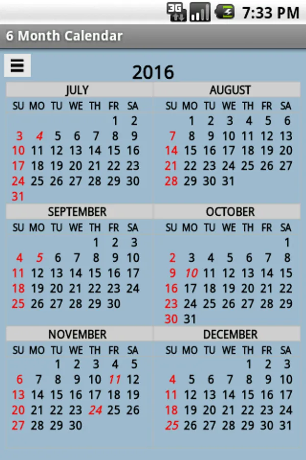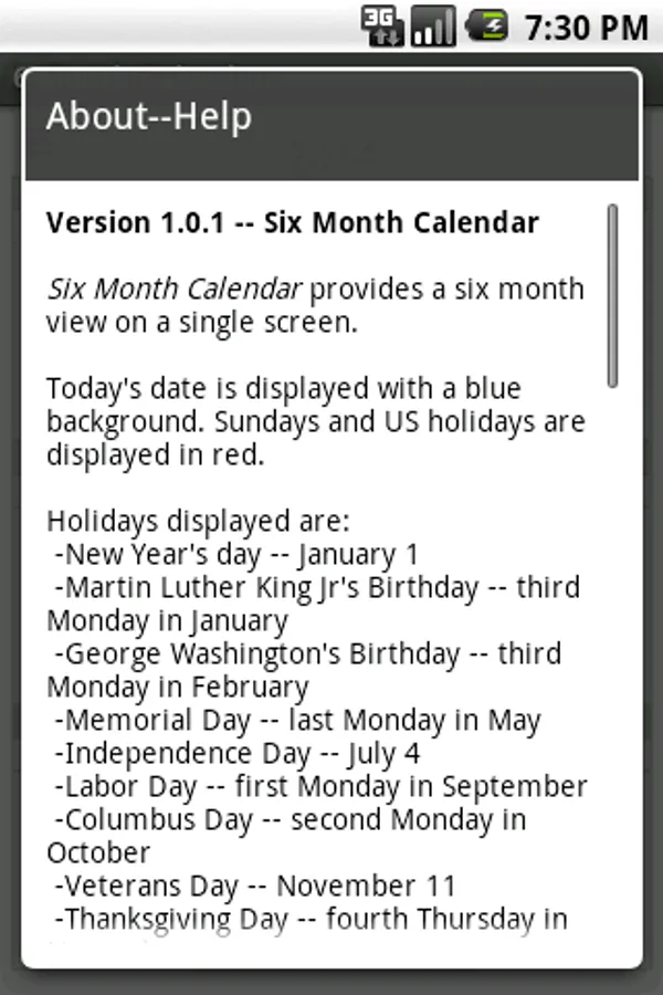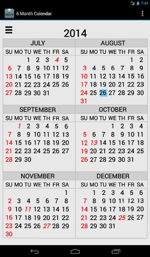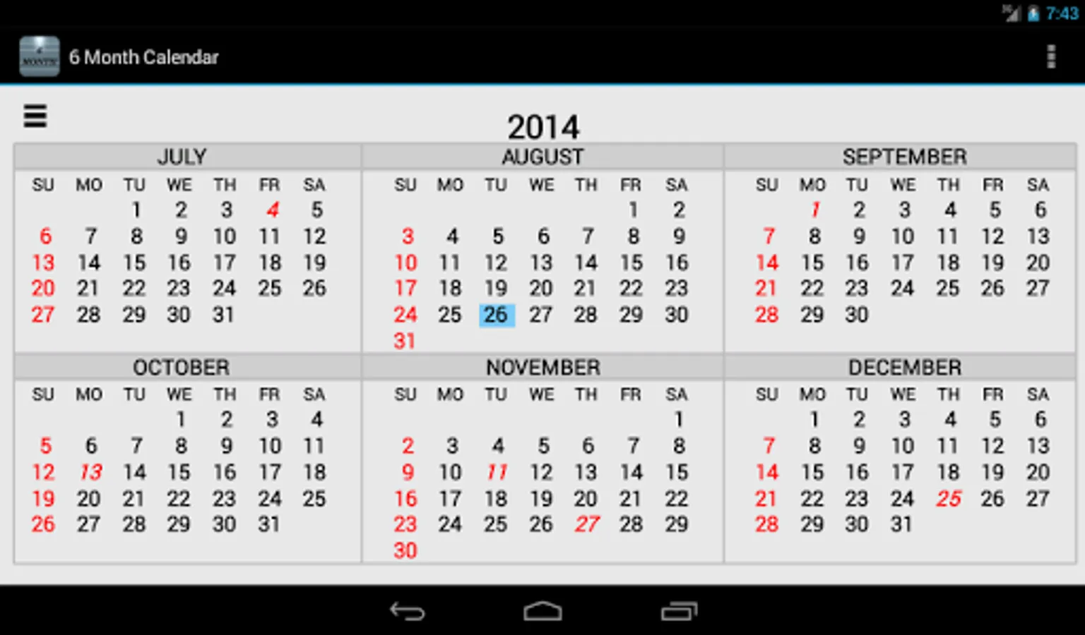Six Month Calendar is a "back to basics" calendar providing a view of six months of the year on a single screen. Six month grouping is first and second half of the year.