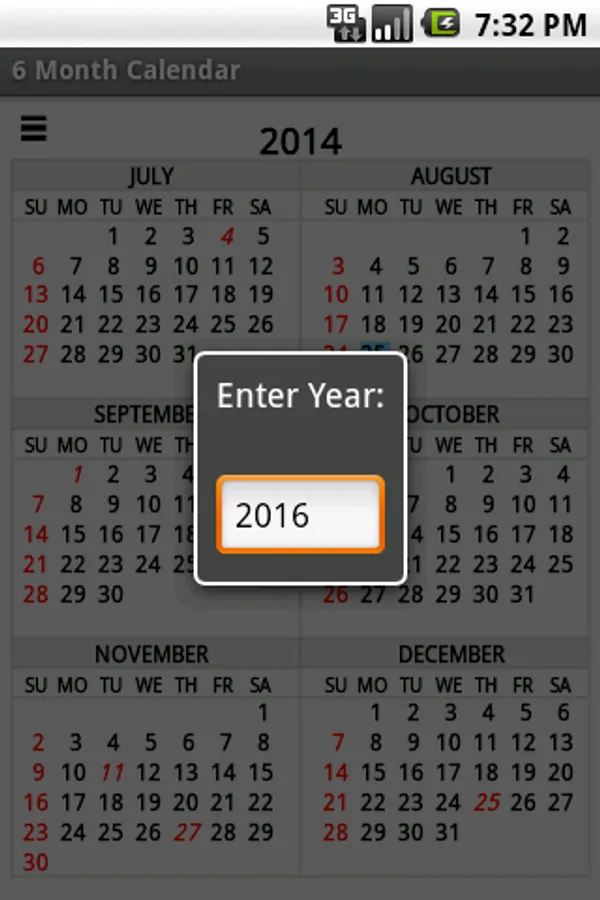 Six month group containing current month is displayed at startup. Swipe to change the displayed months by six months. A year can be entered via the keyboard and displayed with the shown months unchanged. The background is changed to "blue" when displaying other than the current year.