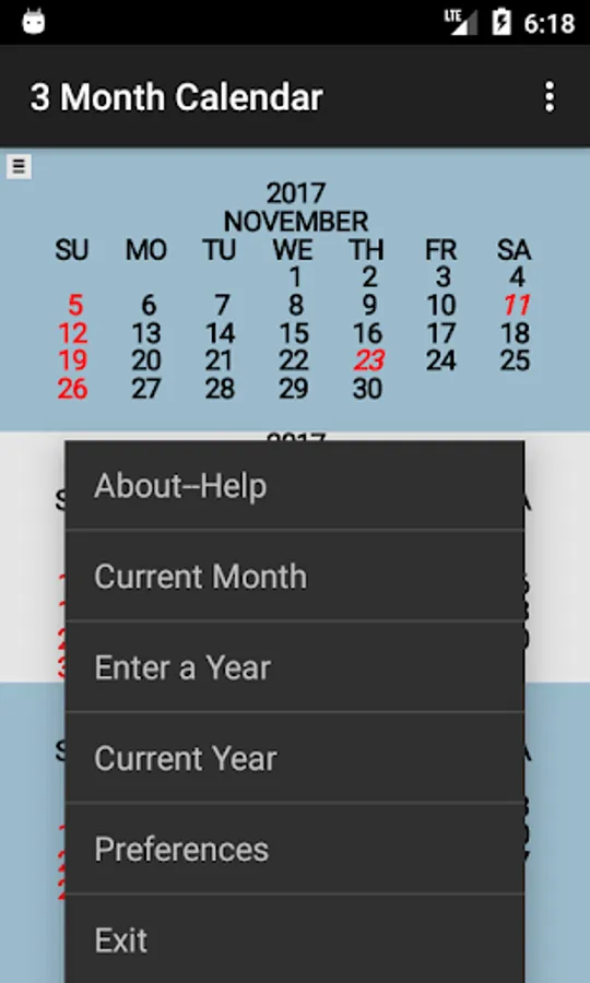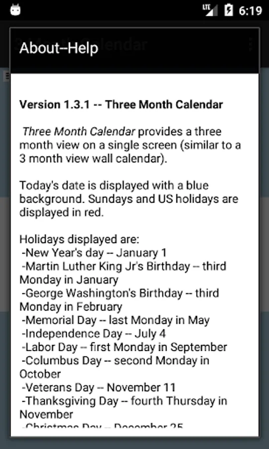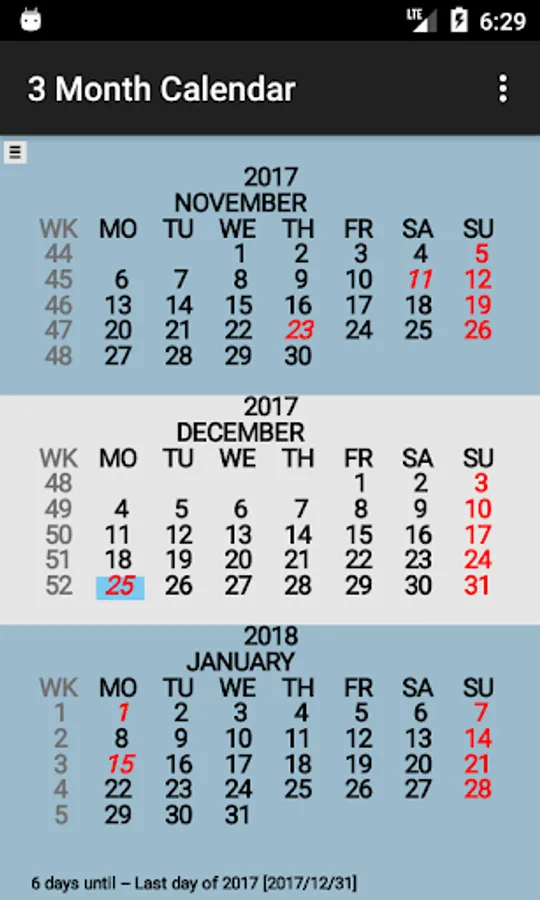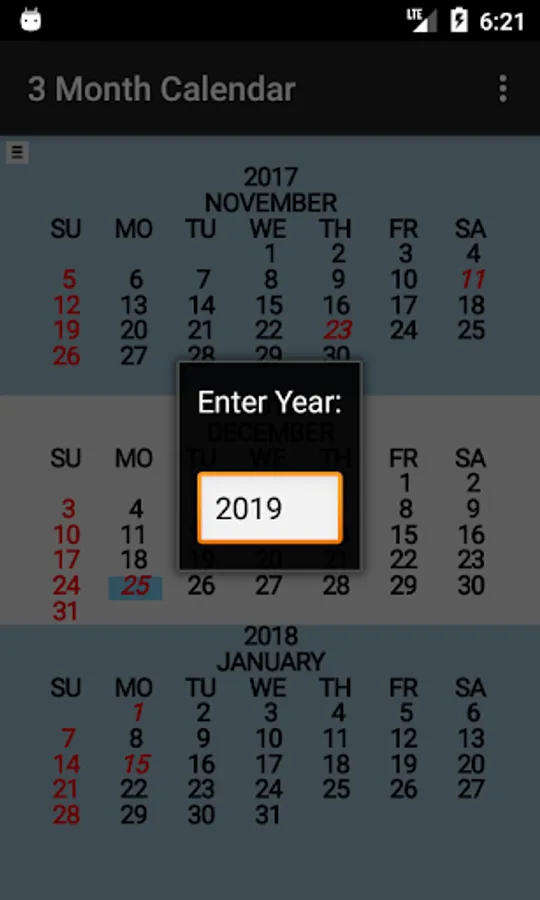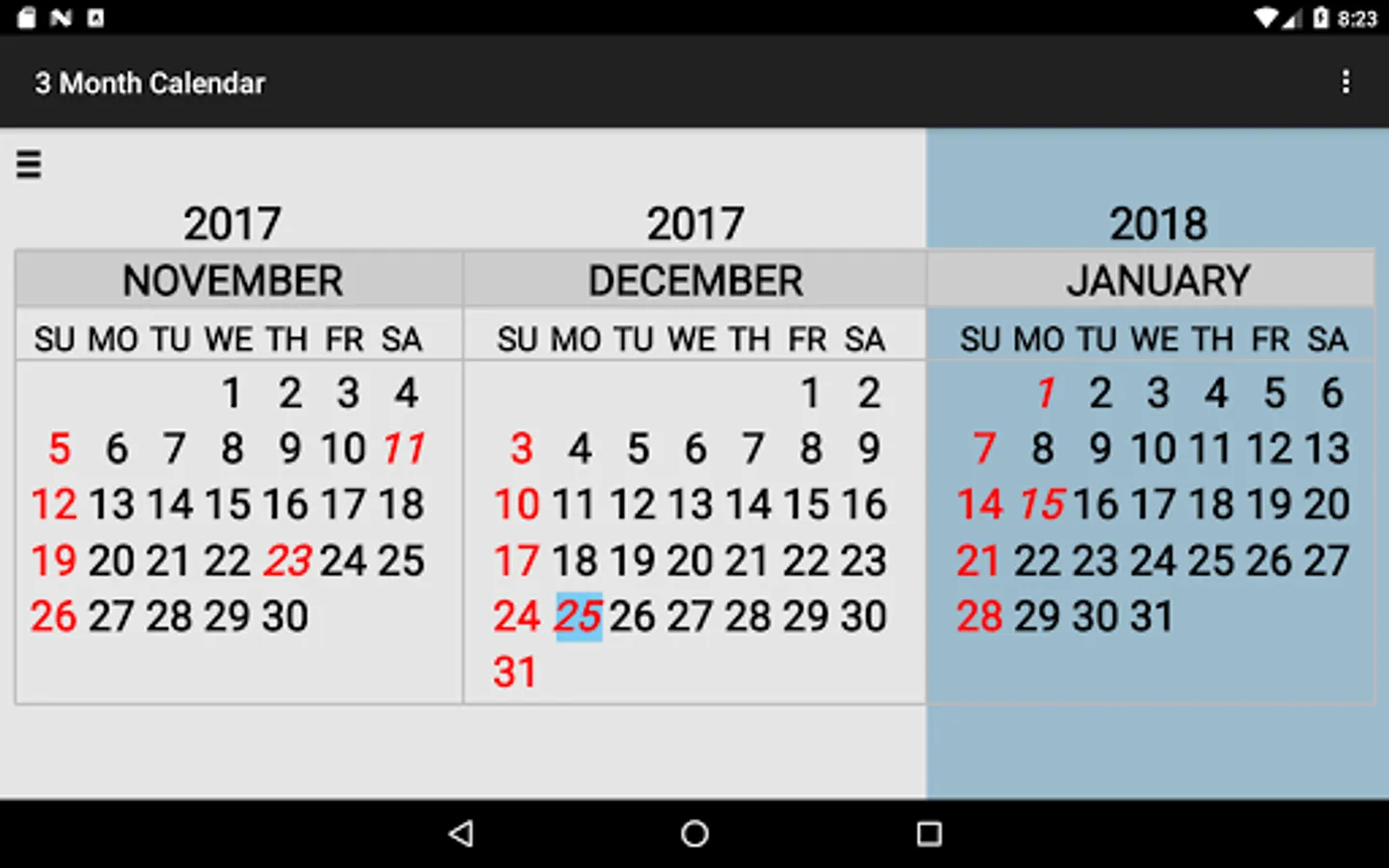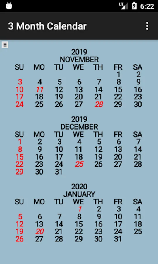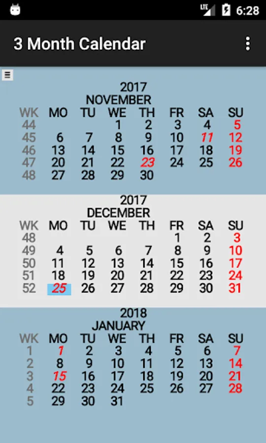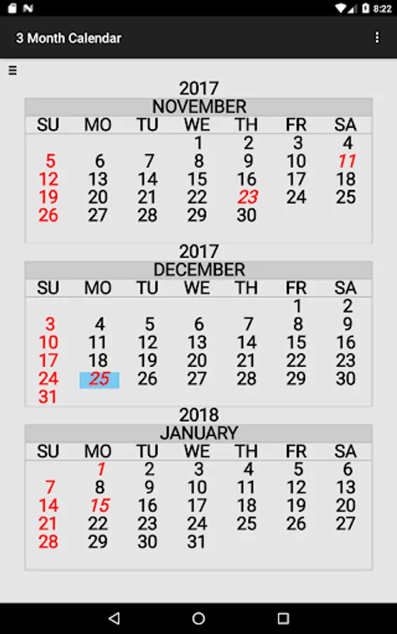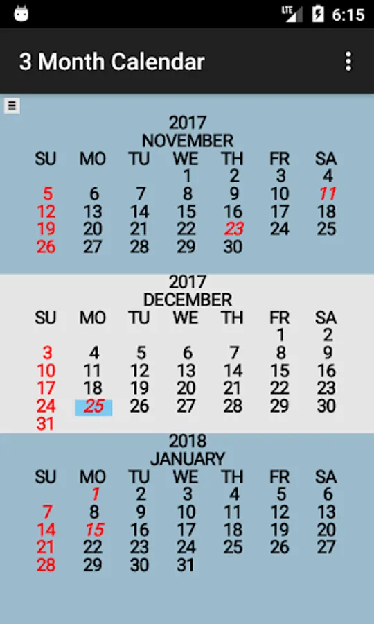 Three Month Calendar is a "back to basics" calendar providing a view of three months of the year on a single screen (similar to the 3 month view wall calendar).