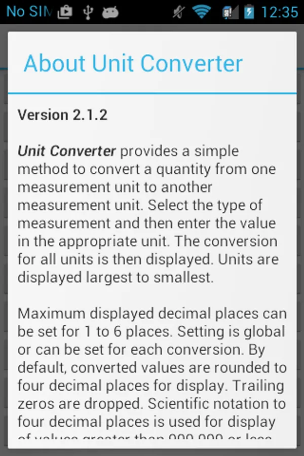 Maximum displayed decimal places can be set for 1 to 6 places. Setting is global or can be set for each conversion. By default, Converted values are rounded to four decimal places for display. Trailing zeros are dropped. Scientific notation to four decimal places is used for display of values greater than 999 999 or less than 0.001 (for four decimal places). (Accuracy may degrade due to accumulated rounding errors.)