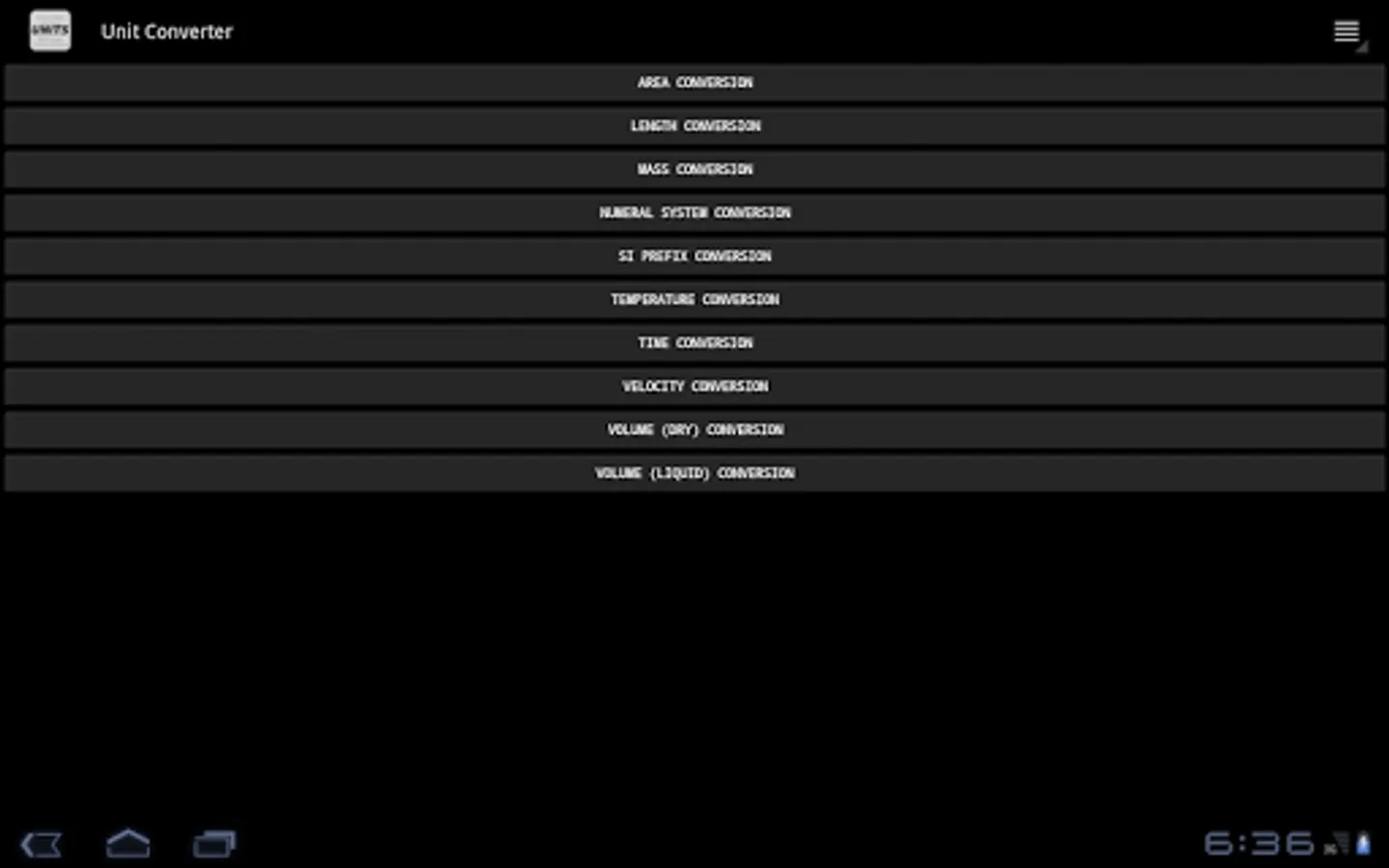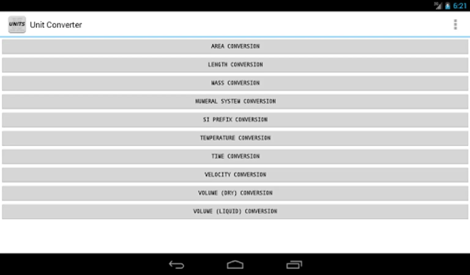 Unit Converter provides a simple method to convert a quantity from one measurement unit to another measurement unit. Select the type of measurement and then enter the value in the appropriate unit. The conversion for all units is then displayed. Units are displayed largest to smallest.