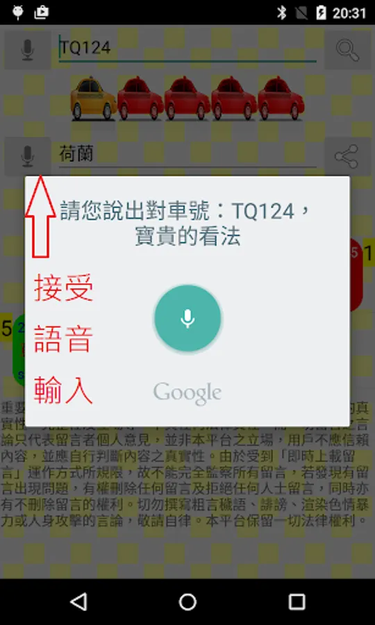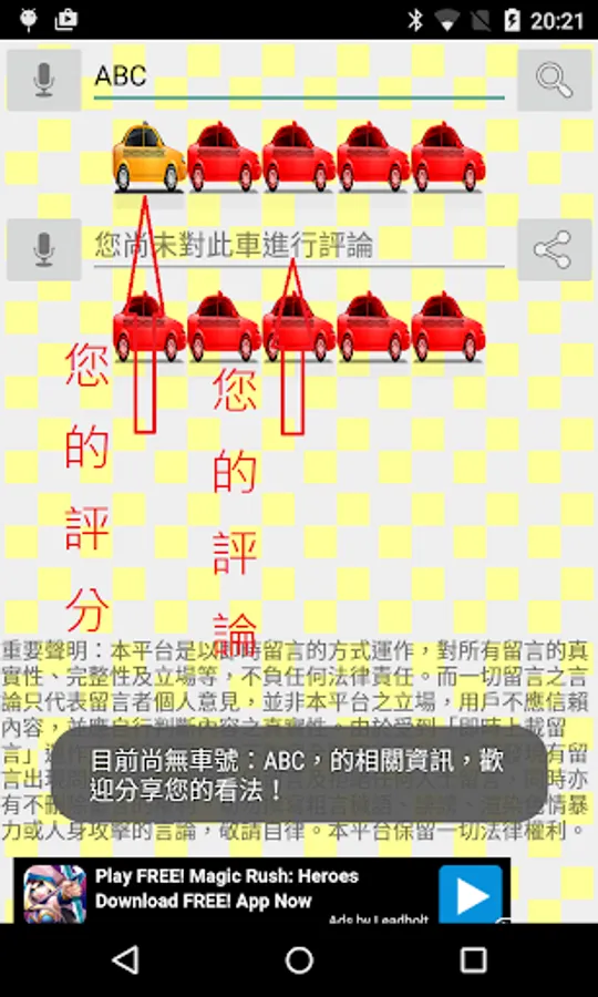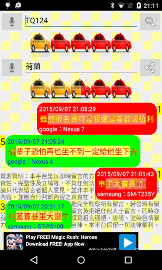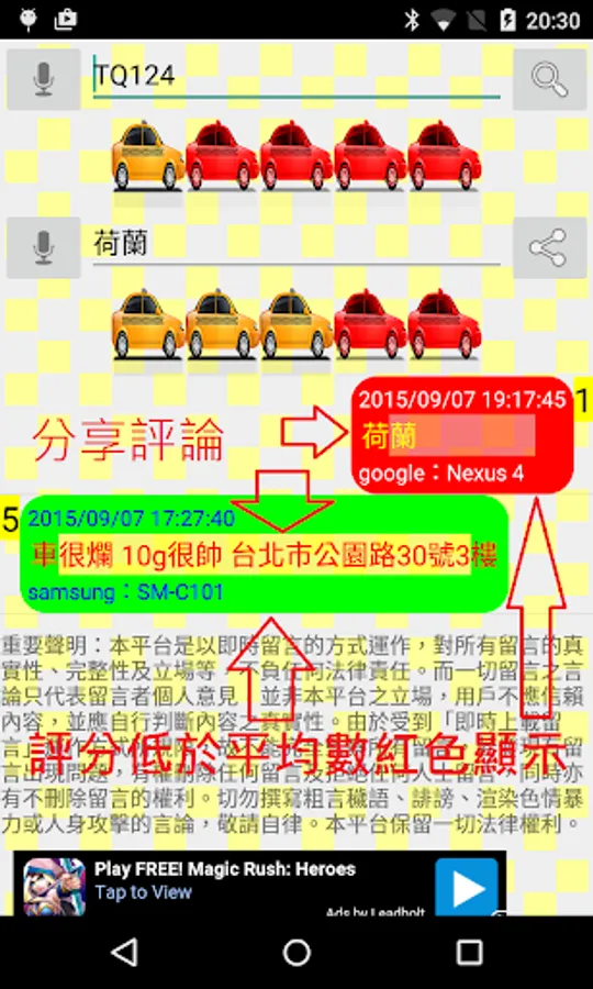 7. 分享人給予的評分若低於該車號平均數者靠右以紅色標示;反之靠左以綠色標記