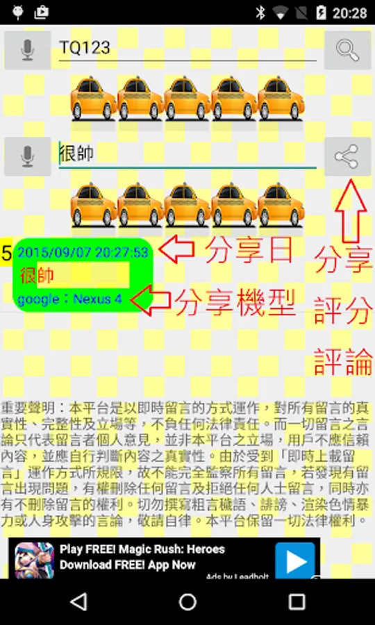 8. 每筆分享最旁數字為分享人給予的評分、上方為分享時間、中間為評論內容、下方為分享設備品牌與型號