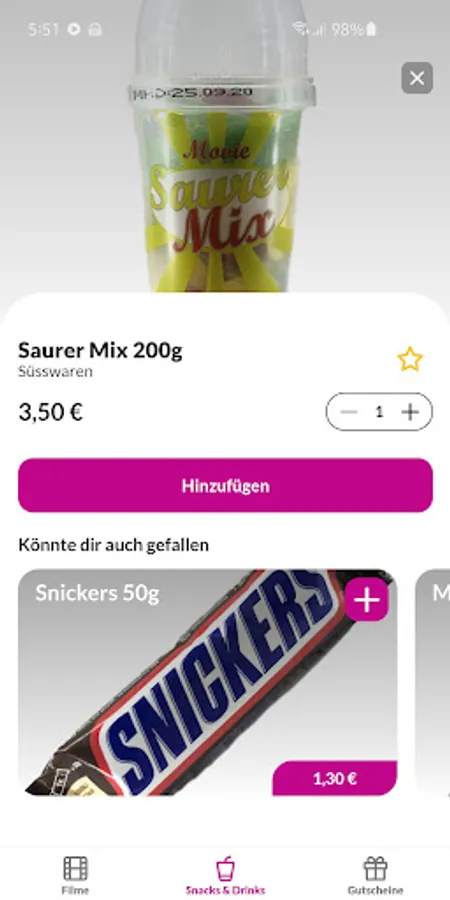 Buy popcorn, snacks and drinks easily from your smartphone using the app.