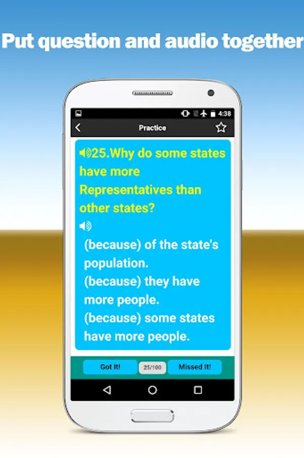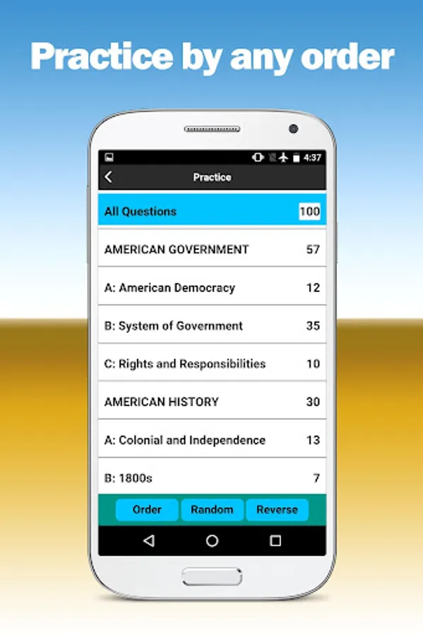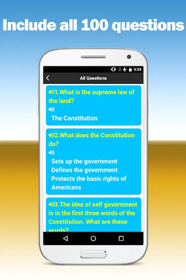 Use this app to practice same as the USCIS Civics Test. Include all 100 questions. Practice any chapter in a random order, reverse order or the order presented in the USCIS documentation. Take a quiz test same as the USCIS Civics Test and see if you can score well enough to pass the actual Interview Test. Also includes audio for all questions and audio for all answers so you can hear the questions and answers read aloud as you study.