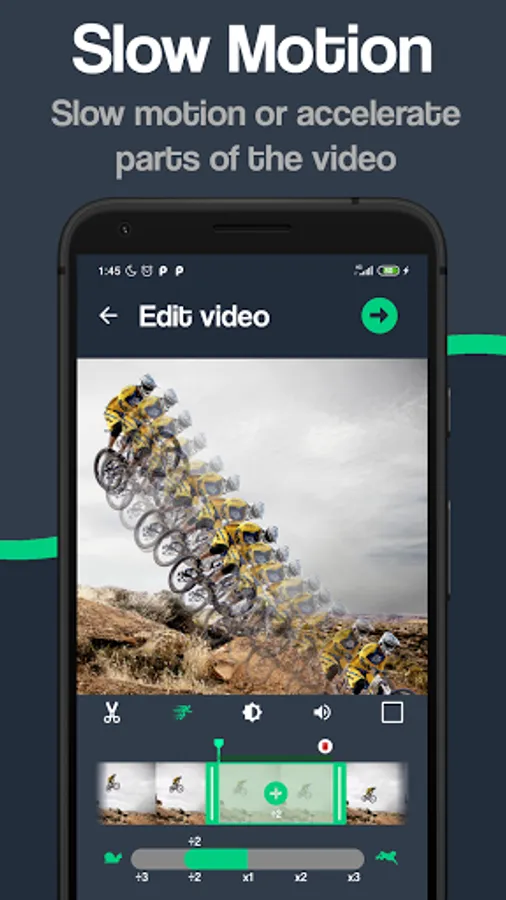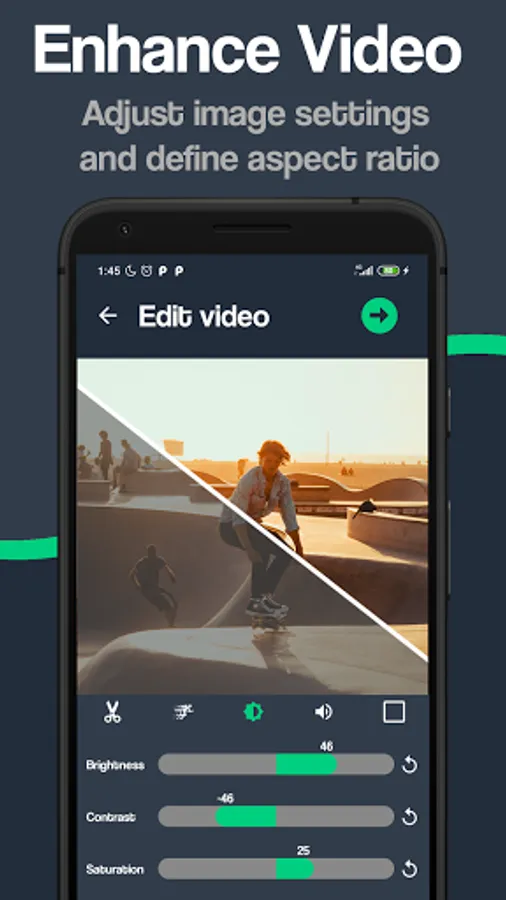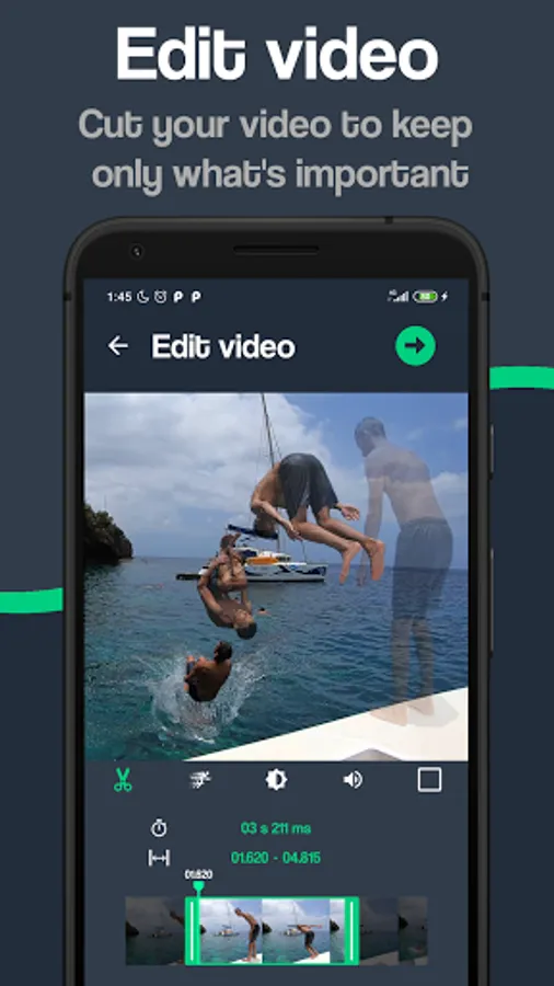 Edit your video, cut parts, create slow motion effects, enhance image, configure volume and image ratio.