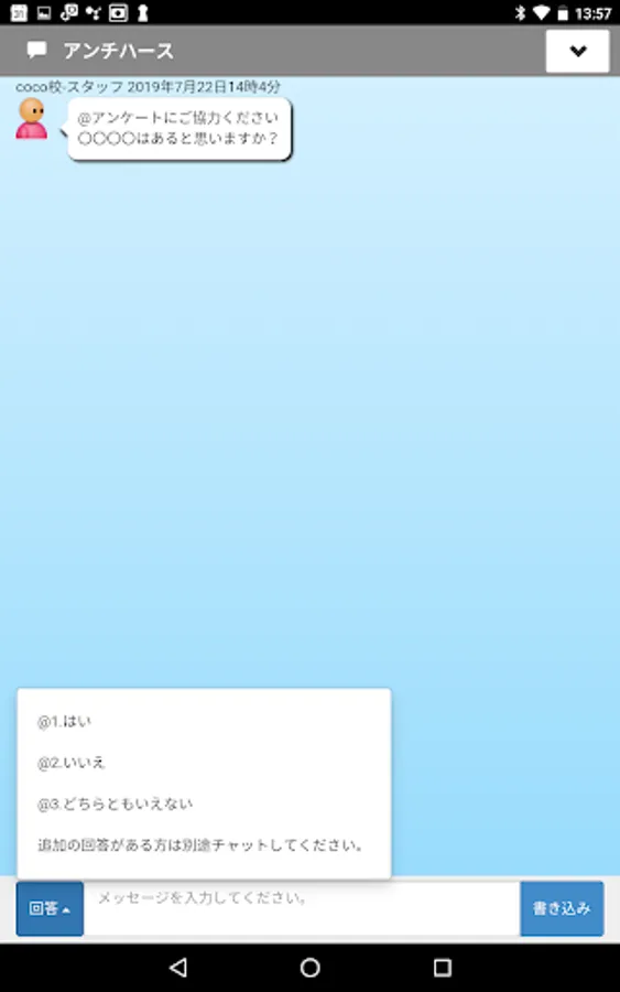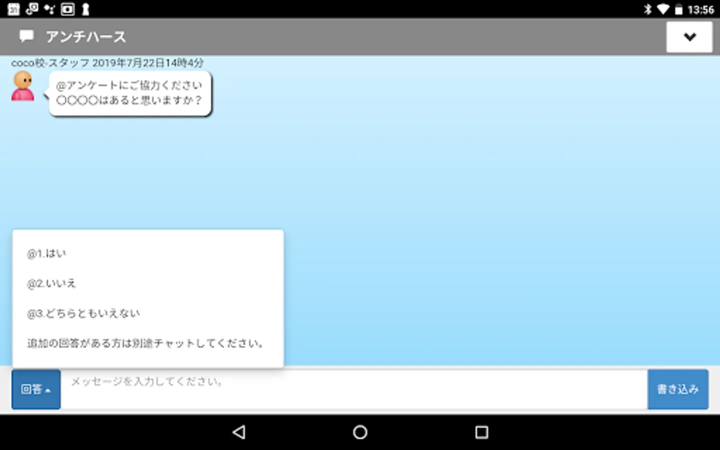 "Anti-Haas" is a chat-type reporting system that can report abuse, power harassment, sexual harassment, bullying etc. in an organization anonymously.