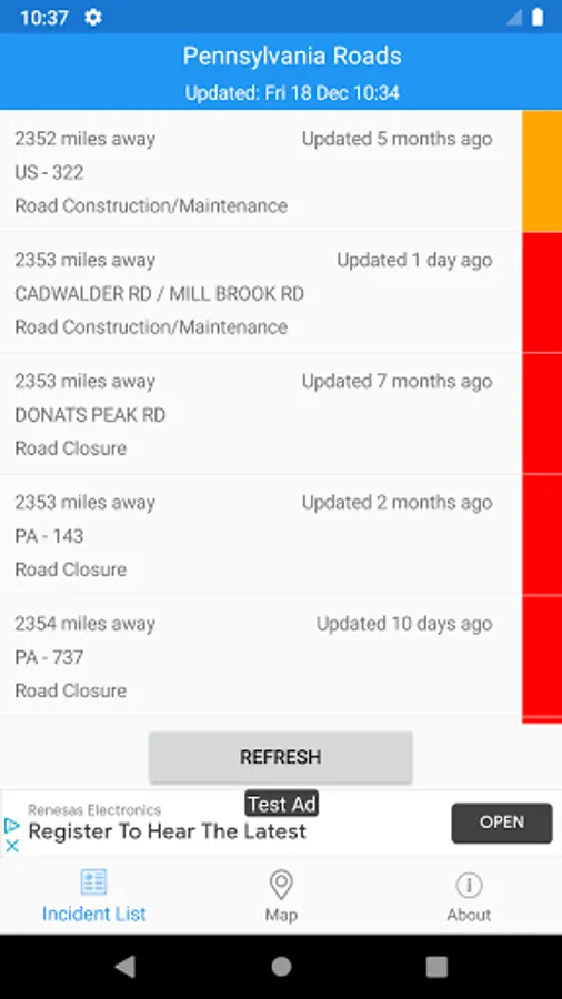 - Shows current incidents in order of distance from your current location (closest incidents are shown first).