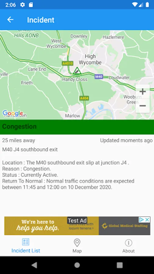 - You can quickly see the distance the incident is from you, the road name, the type of incident and when the incident info was updated.