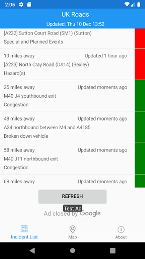 - Shows current incidents in order of distance from your current location (closest incidents are shown first).