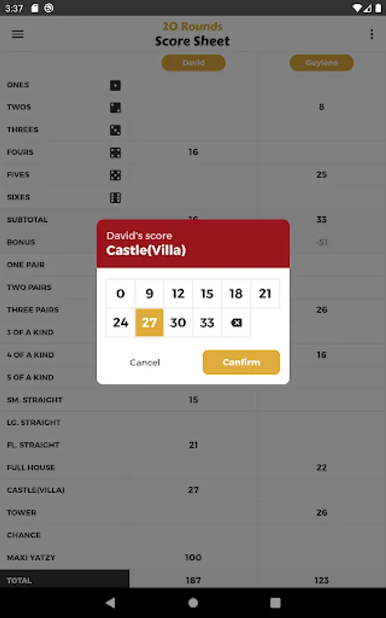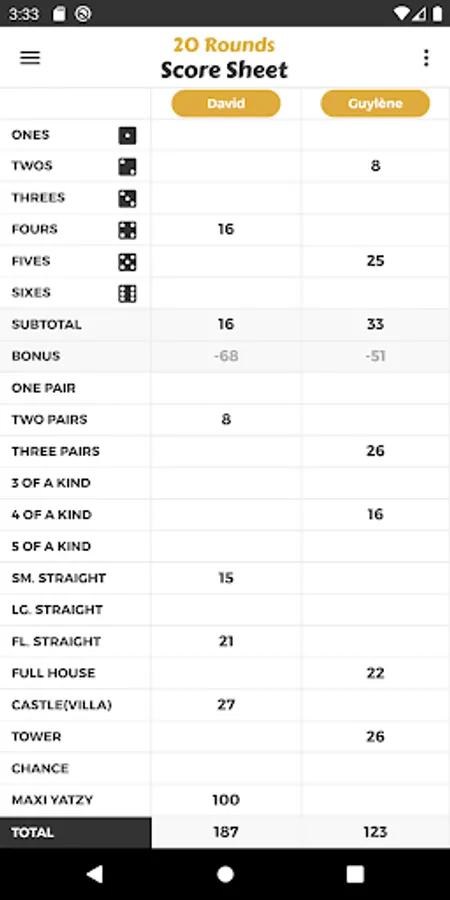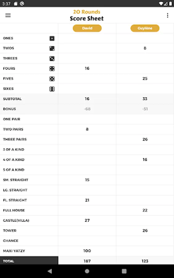 Digital score sheet for Maxi Yatzy game. No more need pen and paper. Use your own dice and start playing with your friends or family.