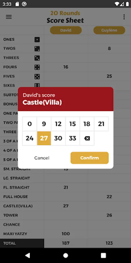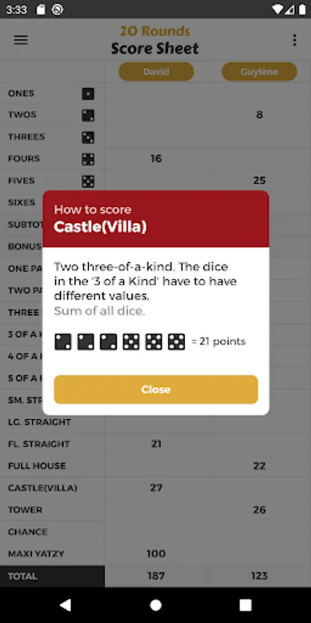 One pair, Two Pairs, Three Pairs, Five of a Kind, Full Straight, Castle/Villa, Tower, Maxi Yatzy.