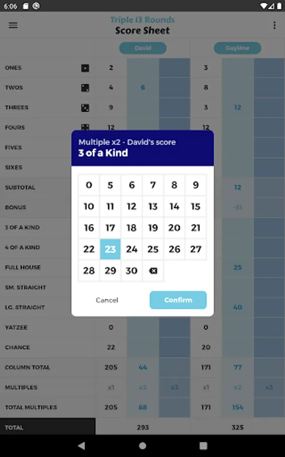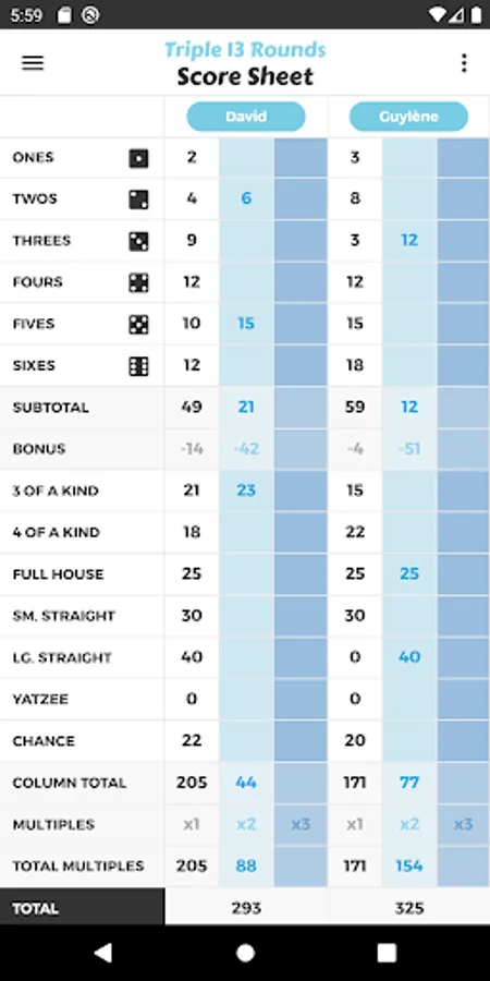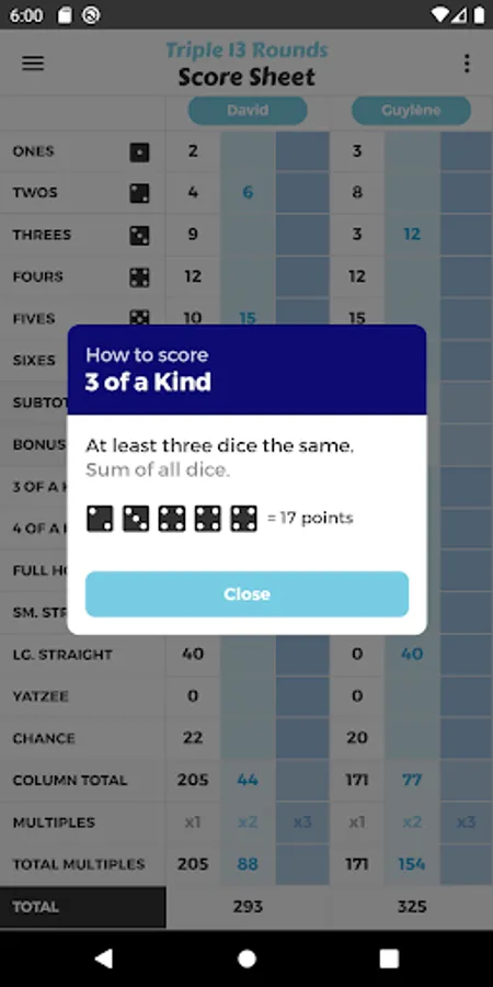 Digital score sheet for Triple Yatzee game. No more need pen and paper. Use your own dice and start playing with your friends or family.