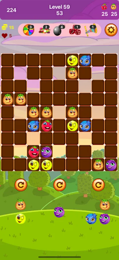 If you can connect 3 or more same colored fruits, those fruits burst and grids become empty.